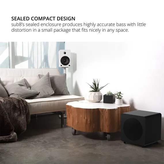 Compact Design At roughly 11 in each direction sub8 fits under desks or in the smallest of apartments where traditional home theatre subwoofers may dominate the space.