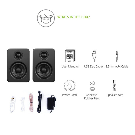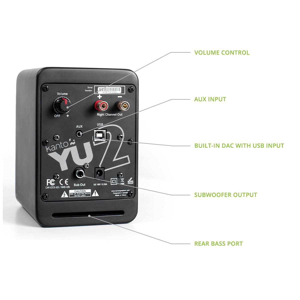 Inputs and OutputsUse the AUX input with the included Kanto 3.5mm cable to connect any device with a headphone jack to your YU2. Lighten the load on your computers CPU by connecting directly to YU2s built-in DAC via a USB cable for a fully digital high-quality audio connection. If you want a little more kick connect a powered subwoofer to the SUB OUT port.