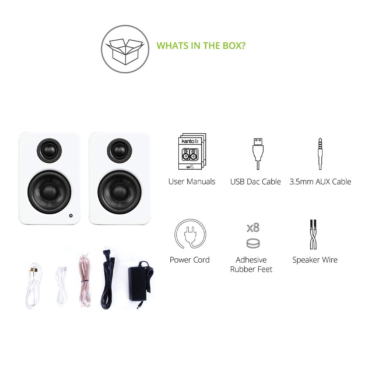 Inputs and OutputsUse the AUX input with the included Kanto 3.5mm cable to connect any device with a headphone jack to your YU2. Lighten the load on your computers CPU by connecting directly to YU2s built-in DAC via a USB cable for a fully digital high-quality audio connection. If you want a little more kick connect a powered subwoofer to the SUB OUT port.