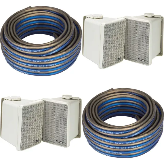 Experience powerful, all-weather sound with the Kicker KB6B 2-Way Indoor Outdoor Speakers Bundle. This package includes 2 pairs of Kicker KB6B speakers and 2 Kicker 46KW1620 Speaker Wire spools measuring 20ft each. The KB6B speakers deliver legendary Kicker audio quality with a 6.5-inch woofer and dual 5-inch horn tweeters, all housed in a weatherproof enclosure. These speakers are versatile, suitable for indoor and outdoor use, and include installation brackets for easy setup. With a peak power of 150 watts and an impedance of 8 ohms, the KB6B speakers offer a frequency response of 55-21k Hz for rich, dynamic sound. The bundle also includes 2 spools of K-Series 16AWG speaker wire, featuring a square Frost Blue wire for positive terminals and a rounded Frost Clear wire for easy identification during installation. These PVC cables are silver-tinned and oxygen-free to ensure optimal signal transfer and sonic accuracy. Elevate your audio experience at home, in the garage, by the pool, or on the go with the Kicker KB6B 2-Way Indoor Outdoor Speaker Bundle.