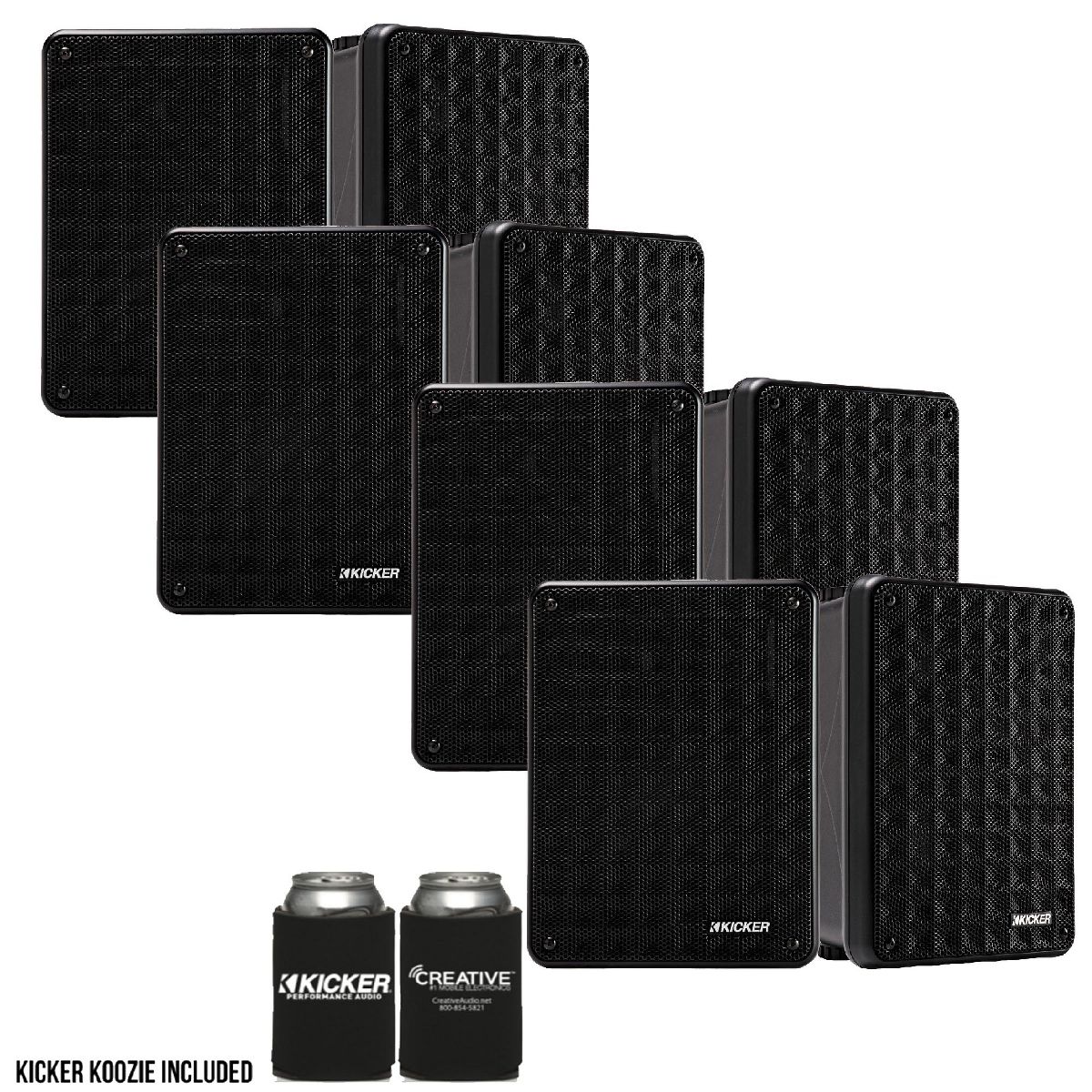 Kicker KB6 Indoor Outdoor Patio Speaker Bundle in Black 8 Speakers total- This bundle includes four (4) pairs of the 46KB6B Black Indoor / Outdoor full-range, high-efficiency Speakers, and a Kicker Coozy. Kicker 46KB6B Black KB6 Outdoor/Indoor full-range, high-efficiency Speakers - Pair. Rock that legendary KICKER sound inside, outside or out and about! Play the KB6 on your backyard deck, under the eaves, inside the shop, or near the pool for great sound, rain or shine. You can even go mobile! Use the universal bracket to mount the KB6 on your boat, off-road vehicle or RV. The KB6 is a full-range, high-efficiency speaker system truly suitable for indoor and outdoor use. Providing an 8-Ohm load and ready to be driven by your home stereo receiver or a car-audio amplifier, you can easily run a single pair or more with minimal effort (min. 18 AWG speaker wire required for easy-pinch terminals). The included bracketing makes it easy to install vertically or horizontally - on nearly any flat surface. Designed as a dual-enclosure weatherproof system, the KB6 features bold 6-1/2 -inch KICKER woofers and 2 x 5-inch, compression-loaded horn tweeters. The woofers utilize precisely tuned polypropylene cones and rugged Santoprene® surrounds. The system acoustically blends powerful bass and thrilling highs for an all-weather KICKER sound you’ll love to listen to all day long. Specifications - • Type: 2-way • Components per enclosure (in., cm): 6-1/2, 16.5 Woofer; 2x5, 5.1x12.7 tweet • Max Rec Amp Power (watts PEAK/RMS)*: 150/75 • Frequency Response (Hz): 55-21k • Standard Dimensions (in.): 11W x 8-1/8H x 8-1/8D • Metric Dimensions (cm.): 27.9W x 20.7H x 20.7D • Impedance (ohms): 8 • Sensitivity (dB 1w/1m): 90 • Grilles: Yes