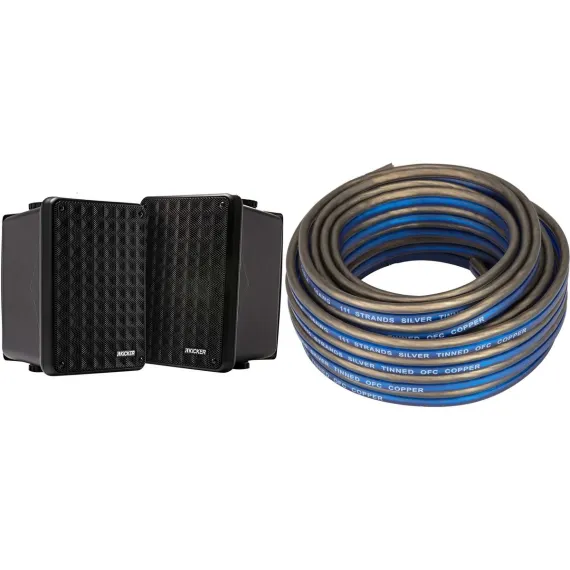 Get ready to elevate your audio experience with this complete bundle featuring the Kicker 46KW1620 K-Series 16AWG Speaker Wire and the Kicker KB6B 2-Way Full Range Indoor Outdoor Speakers. The 20-foot spool of 16 Gauge speaker wire provides excellent signal transfer and sonic accuracy, making it perfect for connecting your speakers to powerful amps with ease. The K-Series speaker wire is designed for easy installation, identified by touch, and includes square Frost Blue wire for positive terminals and rounded Frost Clear wire. The KB6B speakers boast a full-range, high-efficiency system suitable for both indoor and outdoor use. Featuring 6.5-inch woofers and 2 x 5-inch horn tweeters, these weatherproof speakers deliver powerful bass and thrilling highs for an all-weather sound experience. With a sleek black finish, the KB6B speakers can be mounted vertically or horizontally using the included brackets. Enjoy legendary KICKER sound quality in your patio, garage, poolside, or even on-the-go with these versatile speakers. Specifications include: 2-way type, max power of 150 watts PEAK/RMS, frequency response of 55-21k Hz, and dimensions of 11W x 8-1/8H x 8-1/8D inches. Elevate your audio setup effortlessly with this powerful and versatile bundle.