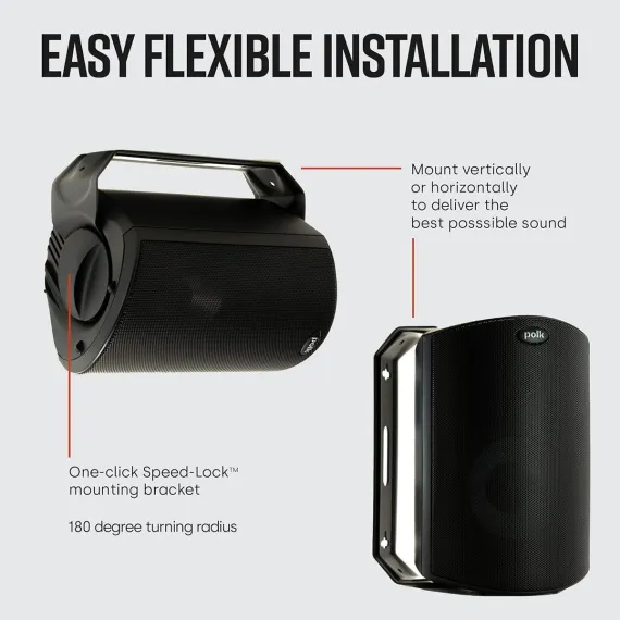 •Speed-Lock mounting system for easy safe one-handed installations even in difficult locations. The greatly simplified mounting procedure means fewer parts to juggle. Simply mount the bracket and click the speaker into place. Aim it and tighten it down and fini! Outdoor convenience indoor sound quality!