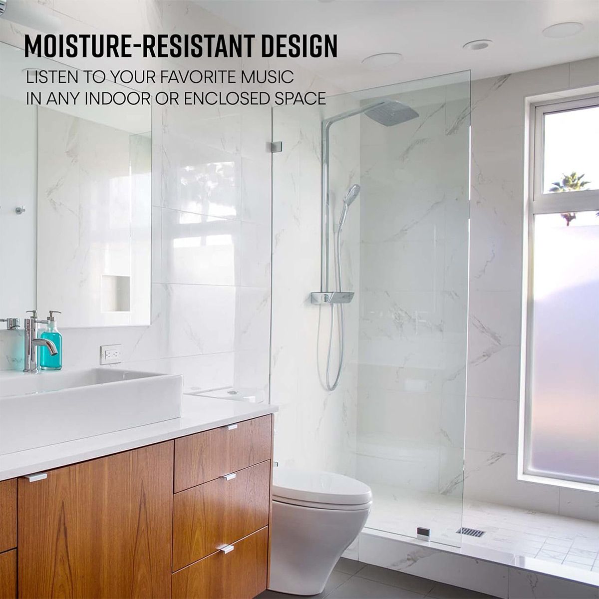 Fill your room with great sound without sacrificing an inch of floor space to bulky speakers. Polk's MC80 speakers install flush in your ceiling for a sleek dcor-friendly look. The 3/4" aimable tweeter lets you direct the high-frequencies where you like so you can fine-tune your system's sound. The 8" woofer provides rich smooth lows. And this speaker's moisture-resistant design means you can use it in your kitchen bathroom or even under the eaves outside.