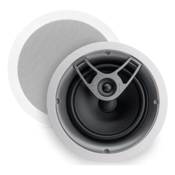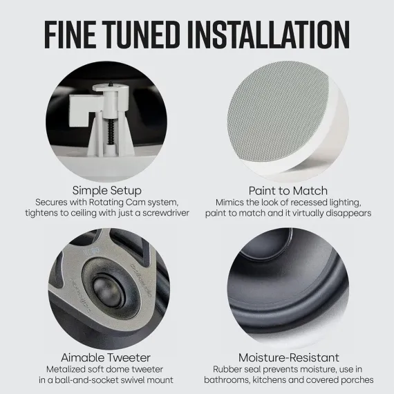 Fill your room with great sound without sacrificing an inch of floor space to bulky speakers. Polk's MC80 speakers install flush in your ceiling for a sleek dcor-friendly look. The 3/4" aimable tweeter lets you direct the high-frequencies where you like so you can fine-tune your system's sound. The 8" woofer provides rich smooth lows. And this speaker's moisture-resistant design means you can use it in your kitchen bathroom or even under the eaves outside.
