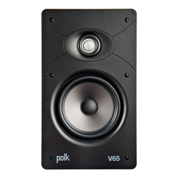 The Polk V65 is an in-wall speaker designed to deliver clear dynamic sound for music and home theater applications. It features a 6.5" Dynamic Balance mid-bass driver and a 1" pivoting silk-dome tweeter providing smooth detailed audio with wide dispersion. Its low-profile Vanishing-Series grille sits nearly flush to the wall allowing it to blend seamlessly into any room dcor. Installation is straightforward thanks to Polks rotating cam mounting system which ensures a secure vibration-free fit. With its balanced performance and flexible placement options the V65 is well-suited for front surround or whole-home audio use.