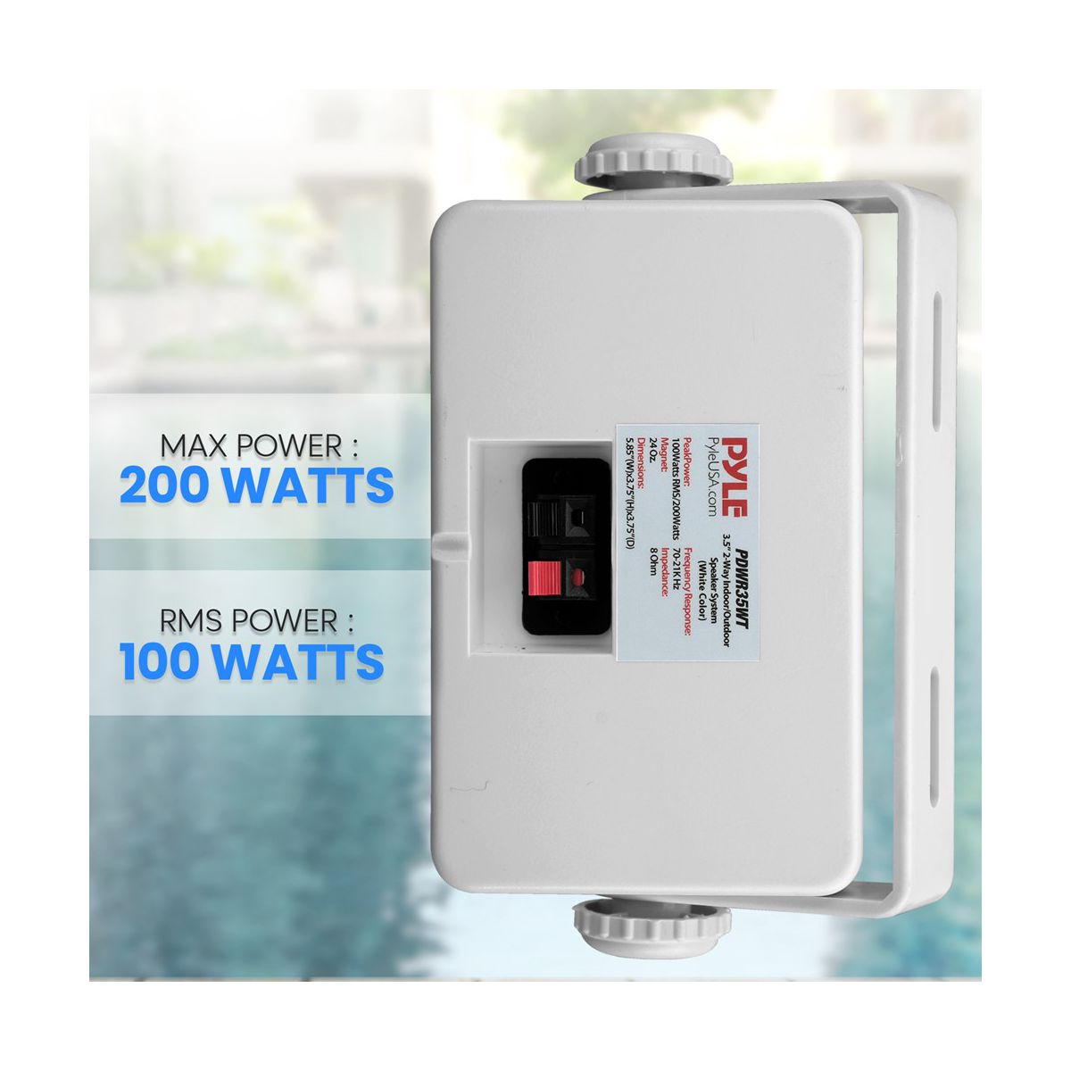 Experience exceptional sound quality with the Pyle PDWR35WT 3.5" Indoor/Outdoor Waterproof Wall Mount Speakers. These white speakers are perfect for any outdoor environment, from boats and decks to patios and poolside areas. Featuring a completely waterproof design and heavy-duty ABS construction, they are built to withstand the elements. The 3.5" aluminum injection cone woofer delivers excellent midbass, while the 1/2" high compliance polymer tweeter provides crystal clear high frequencies. The capacitor crossover network ensures precise sound separation, and the quick-connect speaker terminals make installation a breeze. Whether you're hosting a party or just enjoying some music outdoors, these speakers offer the perfect combination of durability and high-quality sound.