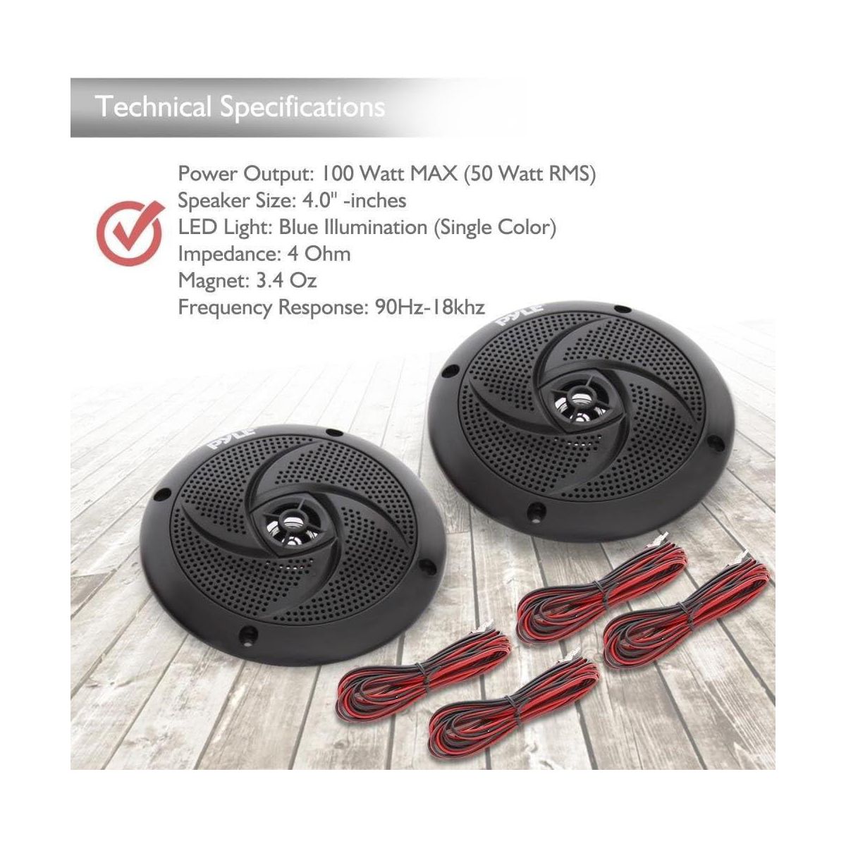 Pyle 4'' Low-Profile Waterproof Marine Speakers with Built-in Blue LED Lights, 100 Watt Max Power Output, 2-Pack