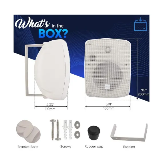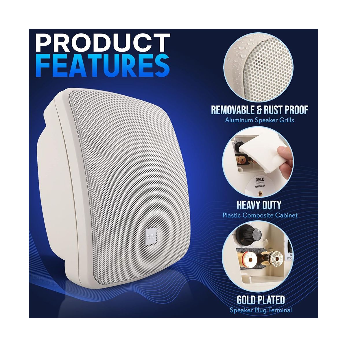 The Pyle PDWR445TW 4" Waterproof On-Wall/Patio Commercial Speaker is perfect for both indoor and outdoor environments. With its marine-grade waterproof construction and IP54 rating, this speaker is built to withstand the elements. It features a 2-way full range stereo sound system, providing high power and deep bass response. The speaker grills are rust-proof, and the gold-plated plug terminals ensure optimal connectivity. The heavy-duty plastic composite cabinet and adjustable mounting bracket make installation easy. Ideal for use by the pool, on the patio, or for public address systems, this speaker offers versatile and reliable audio performance.