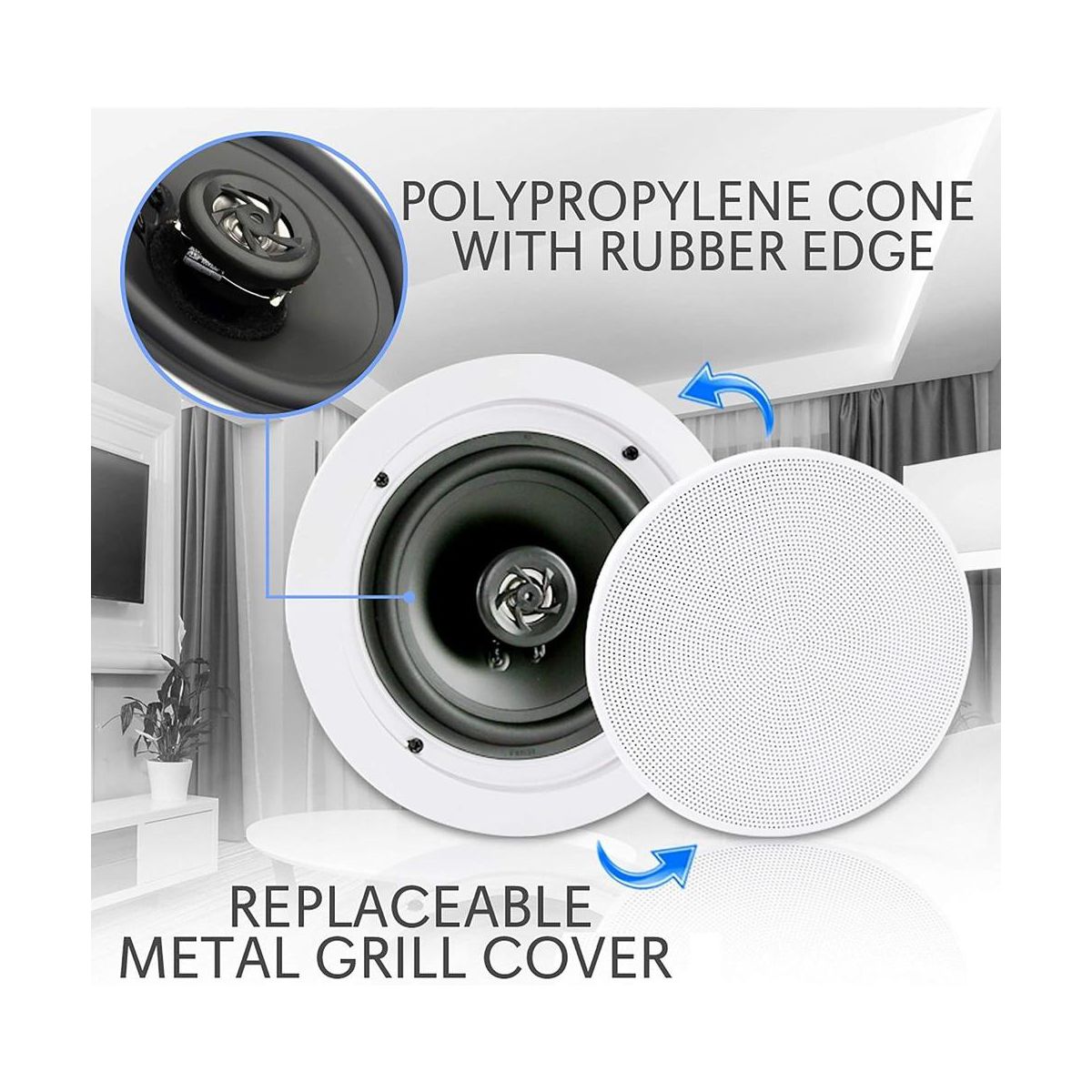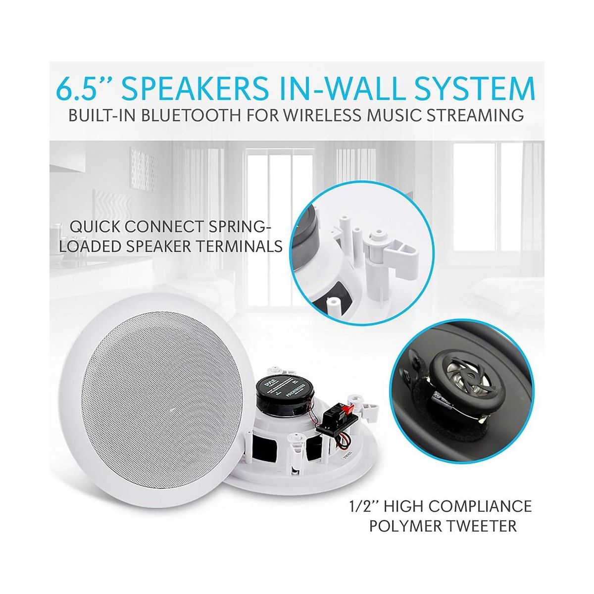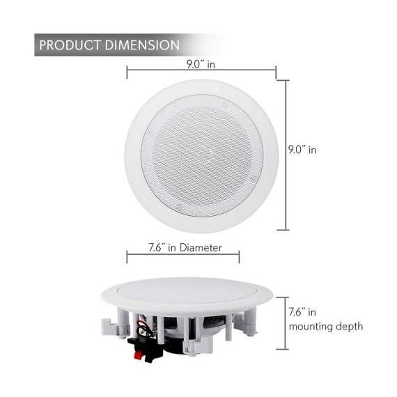 Enhance your home audio experience with the Pyle 6.5" Bluetooth Ceiling/Wall Speakers. These flush-mount speakers deliver powerful stereo sound with 200W max power output. The built-in Bluetooth receiver allows you to stream music wirelessly from your favorite devices, including smartphones, tablets, and laptops. The polymer tweeter and polypropylene cone ensure rich, full-range sound, while the quick-connect terminals make installation simple. Perfect for custom installations, the speakers mount seamlessly in walls or ceilings for a clean, unobtrusive look.