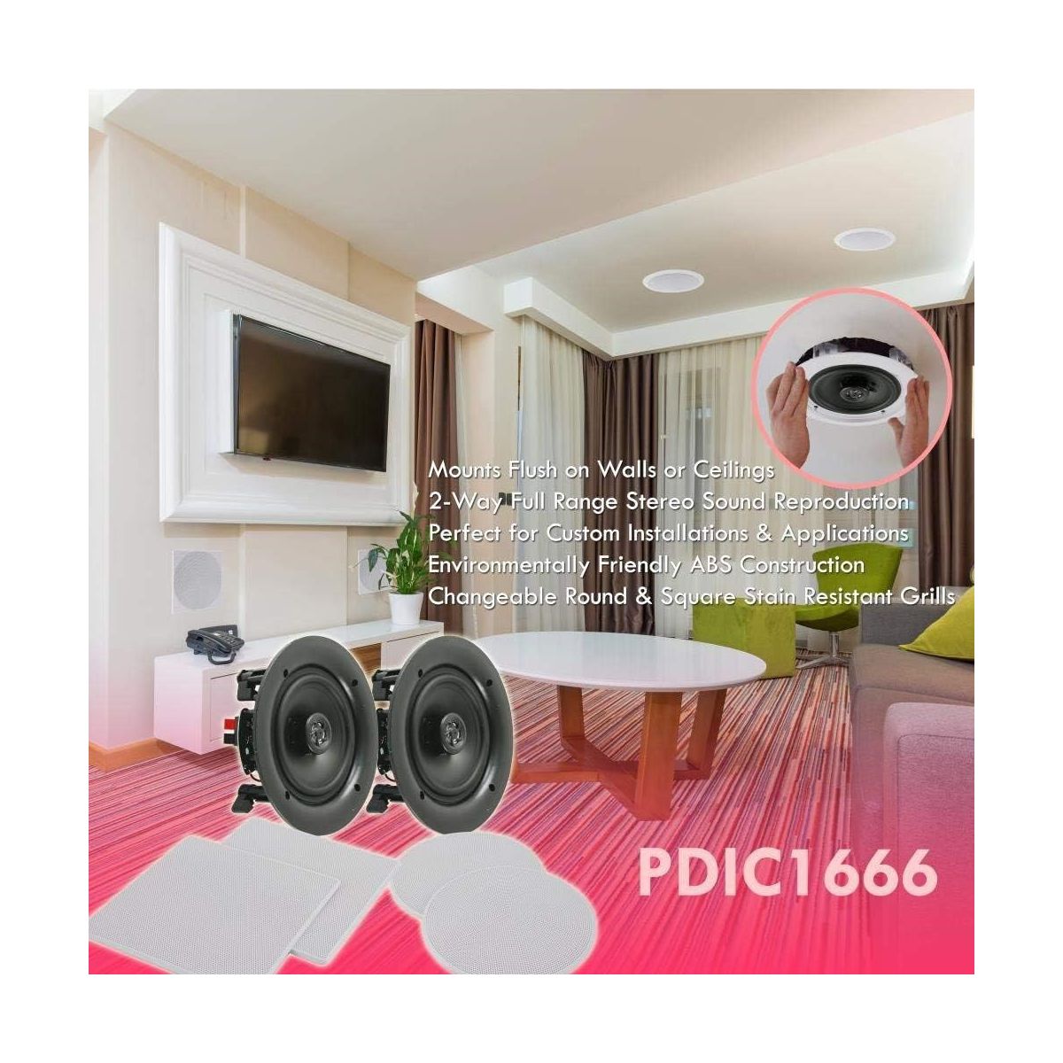 The Pyle 6.5'' Home In-Wall / Ceiling Speakers (PDIC1666) deliver high-quality stereo sound to any room in your home or office without taking up valuable floor space. These speakers feature a dual 6.5'' system capable of handling up to 200 watts of peak power, providing robust and immersive audio. The 1/2'' high compliance polymer tweeter and polypropylene cone with rubber edge ensure a full-range frequency response from 60Hz to 20kHz, delivering clear highs and deep bass.