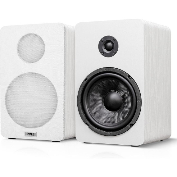The Pyle 6.5" Home Theater Wooden Bookshelf Speakers offer high-quality sound with a sleek, modern design. Featuring a 6.5" woven glass fiber woofer and a 0.75" silk dome tweeter, these 2-way HiFi speakers provide crisp highs and deep, resonant lows. The white wood finish adds a touch of elegance, and the built-in wall mount bracket ensures easy installation. These speakers are perfect for a variety of audio setups, delivering big sound in a compact design ideal for home theaters, bookshelves, or music rooms.
