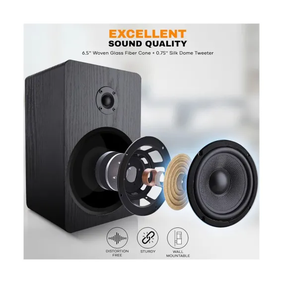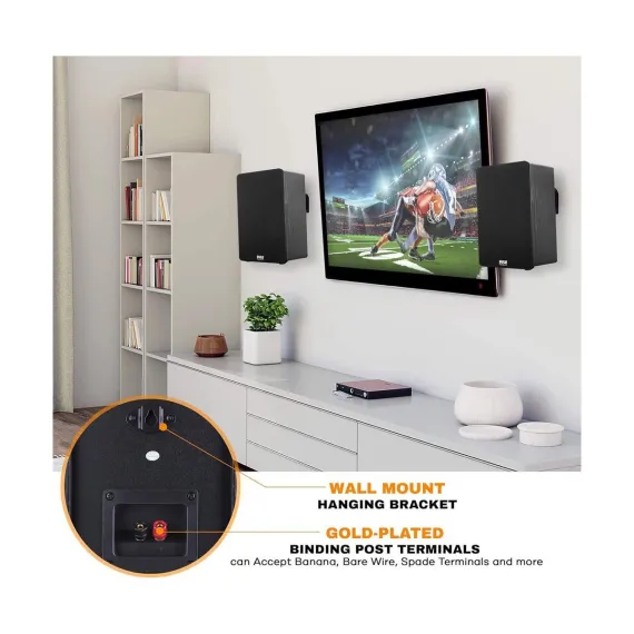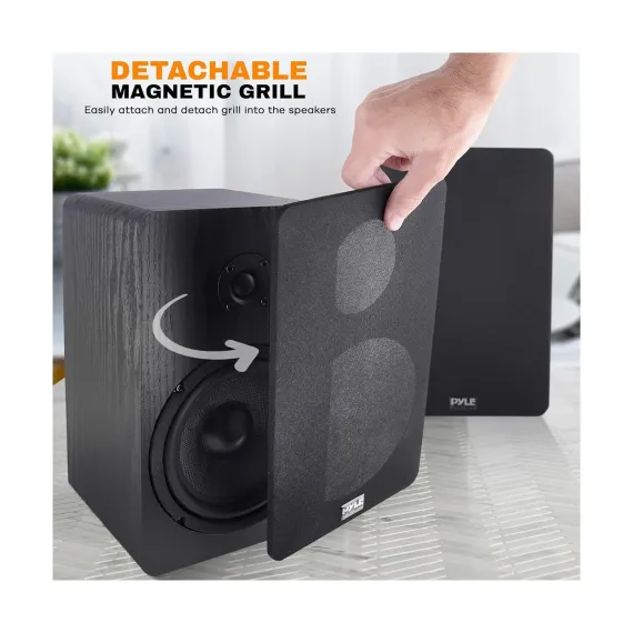 Experience premium sound quality with the Pyle PSMSP6 Home Theater Bookshelf Speakers. These speakers feature an audiophile-grade black woven glass fiber woofer cone and a silk dome tweeter, delivering crisp and realistic highs. The ultra-stiff polypropylene dust cap and rubber surrounds on the woofer ensure durability and superior sound performance. The speakers come with gold-plated 5-way binding post terminals, making it easy to connect with banana plugs, bare wires, or spade terminals. Additionally, the detachable magnetic grill and wall mount hanging bracket provide versatility and convenience.
