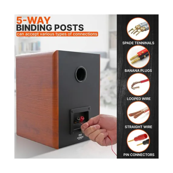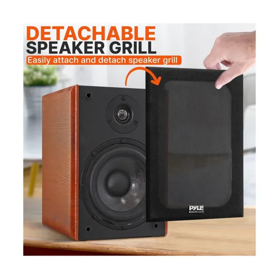 The Pyle PHQBS52 5.25" Home Theater Bookshelf Speakers deliver an audiophile-grade sound experience. Featuring a black painted paper woofer cone and a silk dome tweeter, these speakers offer both deep bass and crisp high-frequency sound. The speakers are constructed with top-quality MDF and finished in a beautiful wood grain design, perfect for any home theater setup. With gold-plated 5-way binding post terminals, they offer versatile connectivity options. These bookshelf speakers are an excellent addition to any audio setup, providing powerful, immersive sound.