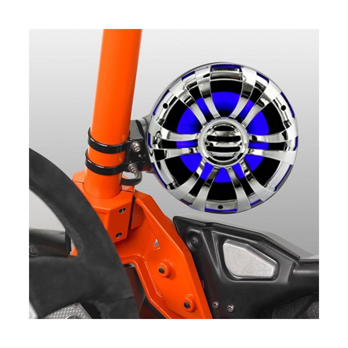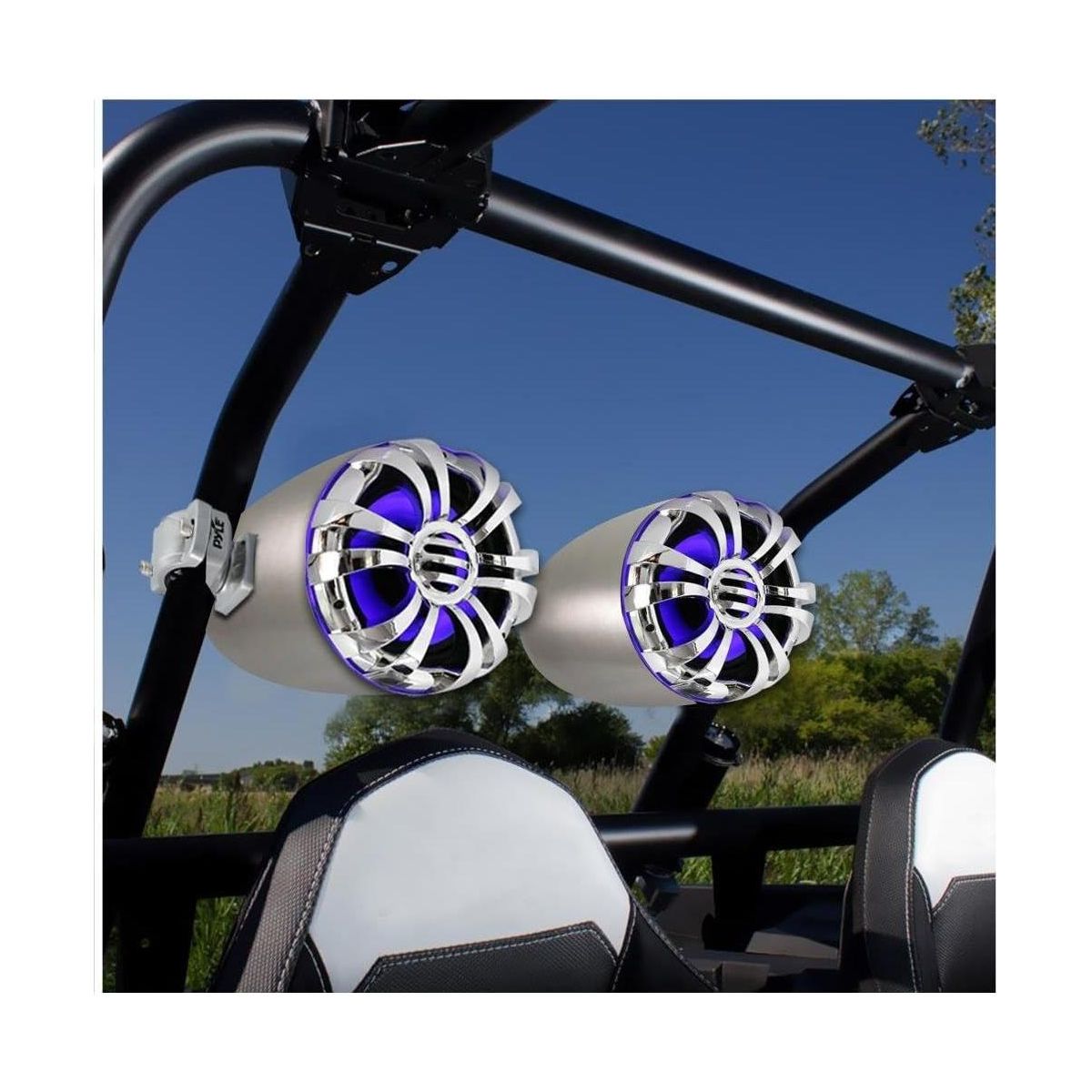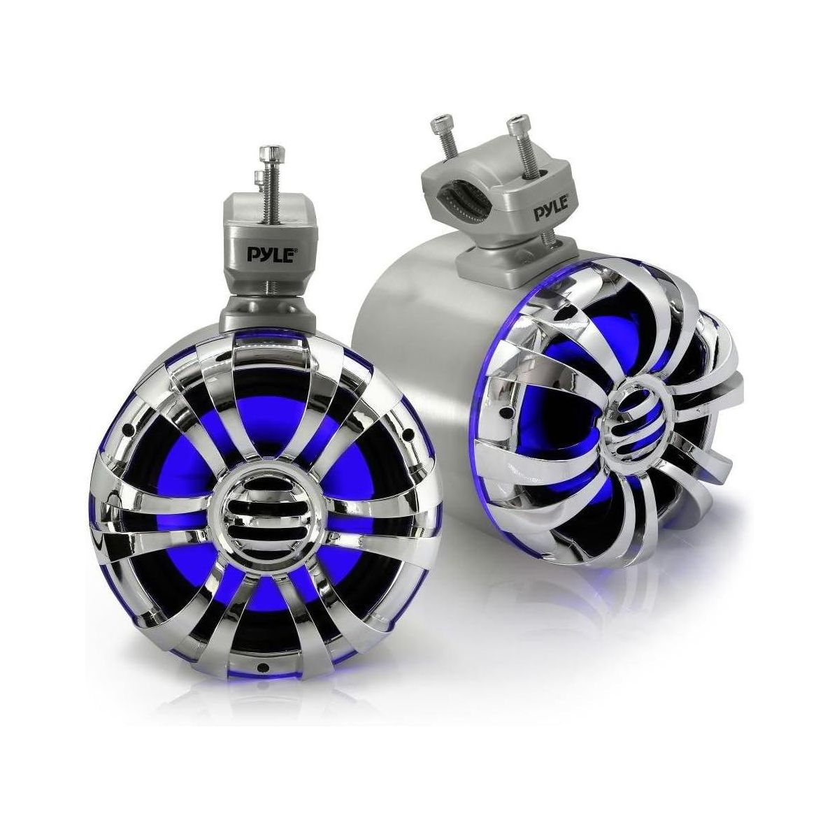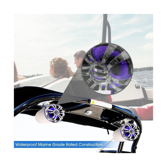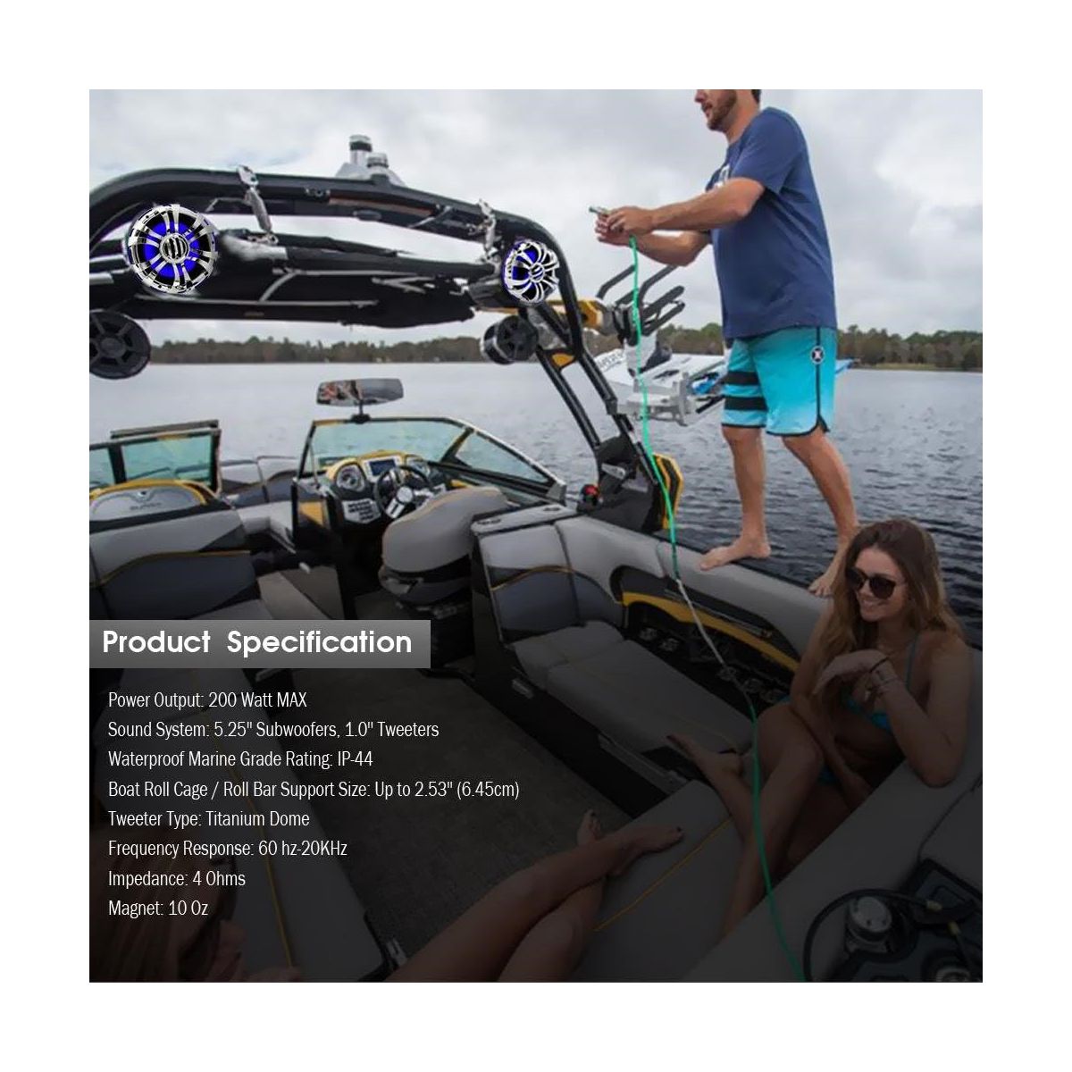 The Pyle PLMRWB50L Waterproof Marine Wakeboard Tower Speakers are the perfect addition to your boat or outdoor adventure. With a rugged stainless steel housing and engineered ABS speaker grills, these 5.25" subwoofers and 1" titanium dome tweeters deliver full-range, high-quality sound that’s perfect for any outdoor or marine environment. The built-in blue LED lights add a striking visual element to your setup, illuminating the atmosphere. Designed for easy installation, these speakers come with universal roll bar mounting clamps that allow 360° positioning. They are waterproof (IP-44 rated), weather-resistant, and UV resistant, ensuring they withstand the elements. Whether you're out on the water or enjoying a party in the yard, these speakers provide excellent sound and reliable performance.