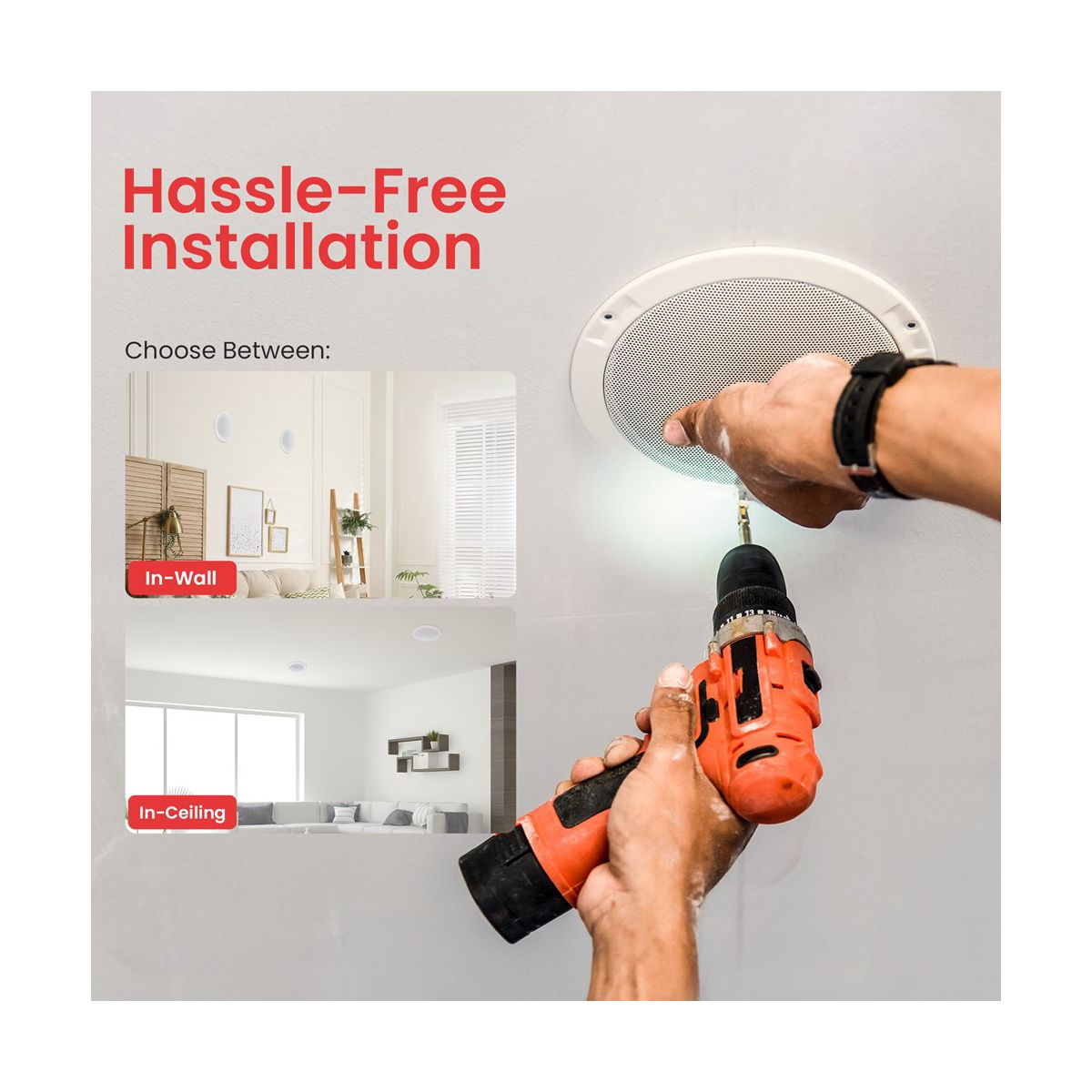 The Pyle PWRC62 is a versatile dual-channel speaker system designed for in-ceiling or in-wall installations. It is moisture-resistant and built with marine-grade construction, making it perfect for areas prone to high humidity or water exposure. Whether you're enhancing the sound in your home, office, or outdoor space, this speaker provides high-quality sound with impressive power handling. The PWRC62 offers easy installation with convenient push-type speaker terminals and comes with all necessary hardware and a cutout template.