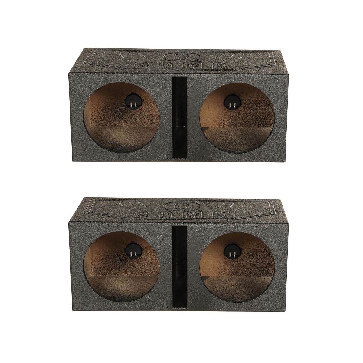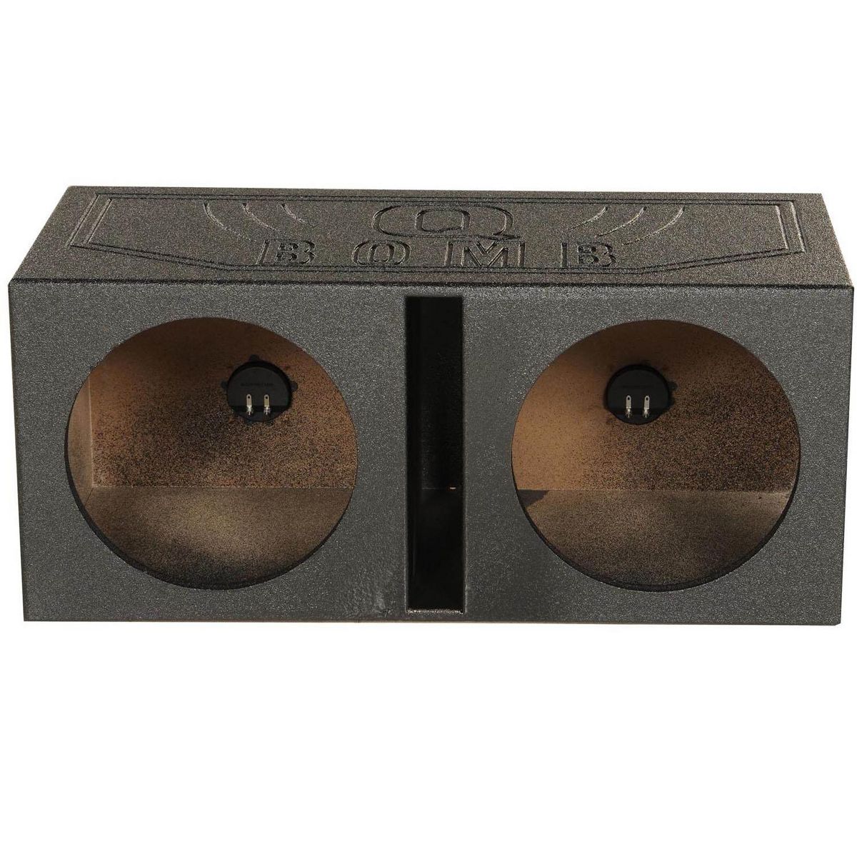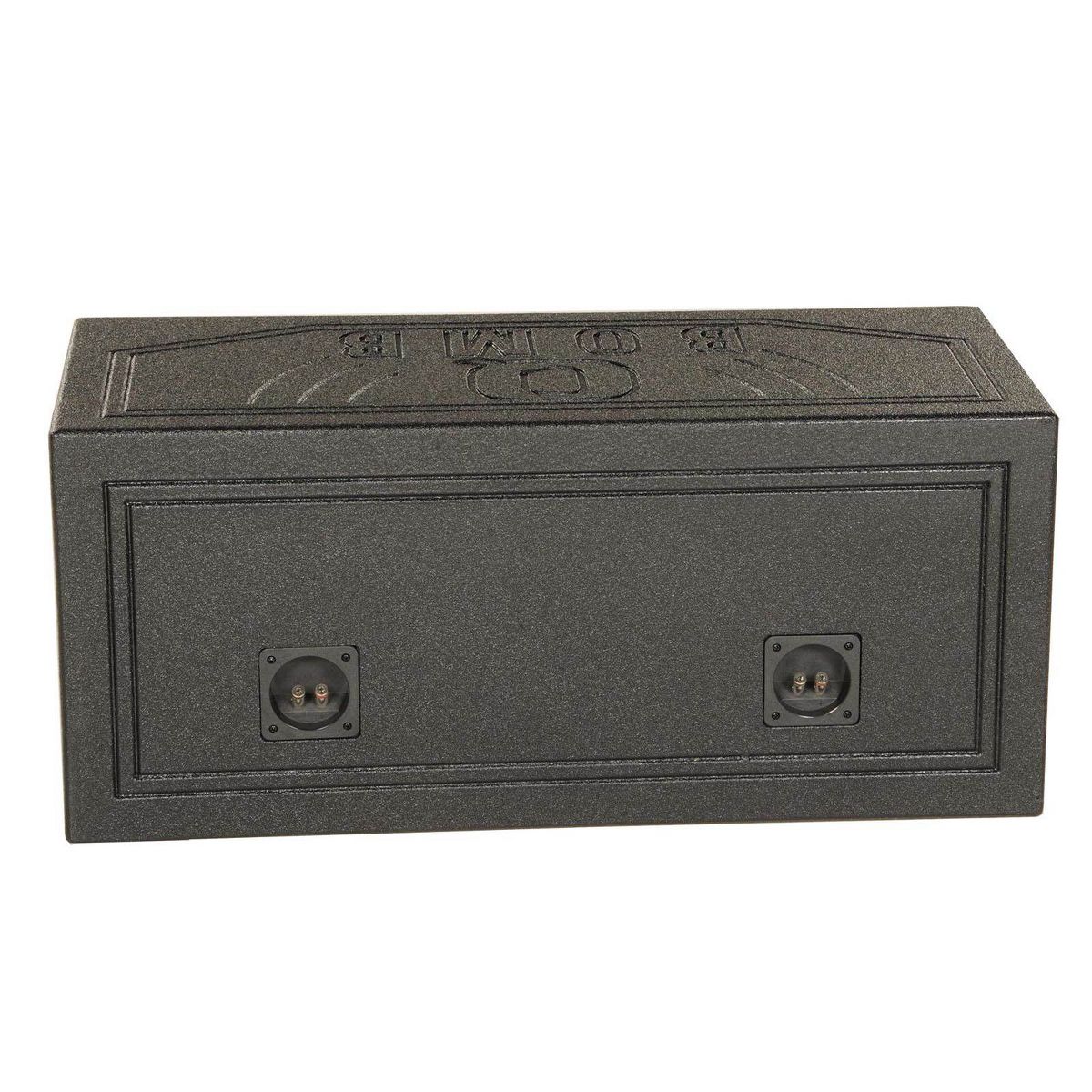 The vented sub box is constructed of 0.75-inch MDF and finished with a black bedliner spray for increased durability and added style. It features a dual vented chamber design with a middle slot port and boasts 1 cubic feet of air space per subwoofer.