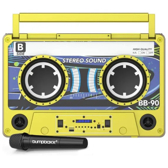 This portable Bluetooth Speaker is in the shape of a retro cassette tape. The Remixx can easily go everywhere, weighing in at only 12.5 pounds. With dual bass radiators, two drivers, and four tweeters, also comes with a wireless microphone for karaoke fun. You can Sync two units wirelessly in TWS (True Wireless Stereo) mode for a louder surround sound experience. Connect your device via Bluetooth or use the Micro SD card slot