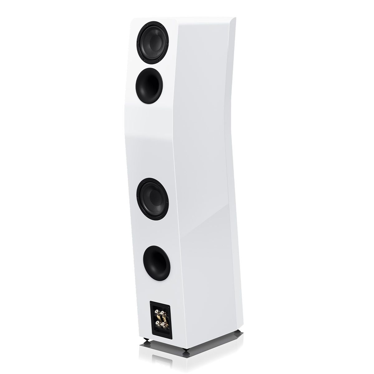 Acoustically Centered Time Alignment Cabinet ArchitectureCurved front baffle aligns all drivers on a vertical plane ensuring sound from each driver reaches your ears at the exact same instant. This maximizes phase coherence for more convincing and immersive soundstage with pinpoint accuracy and imaging. Midrange drivers and woofers are positioned above and below the tweeter allow for seamless crossover blending to create an idealized “point-source” where sound emanates from single point in front of the speaker to optimize dispersion characteristics.