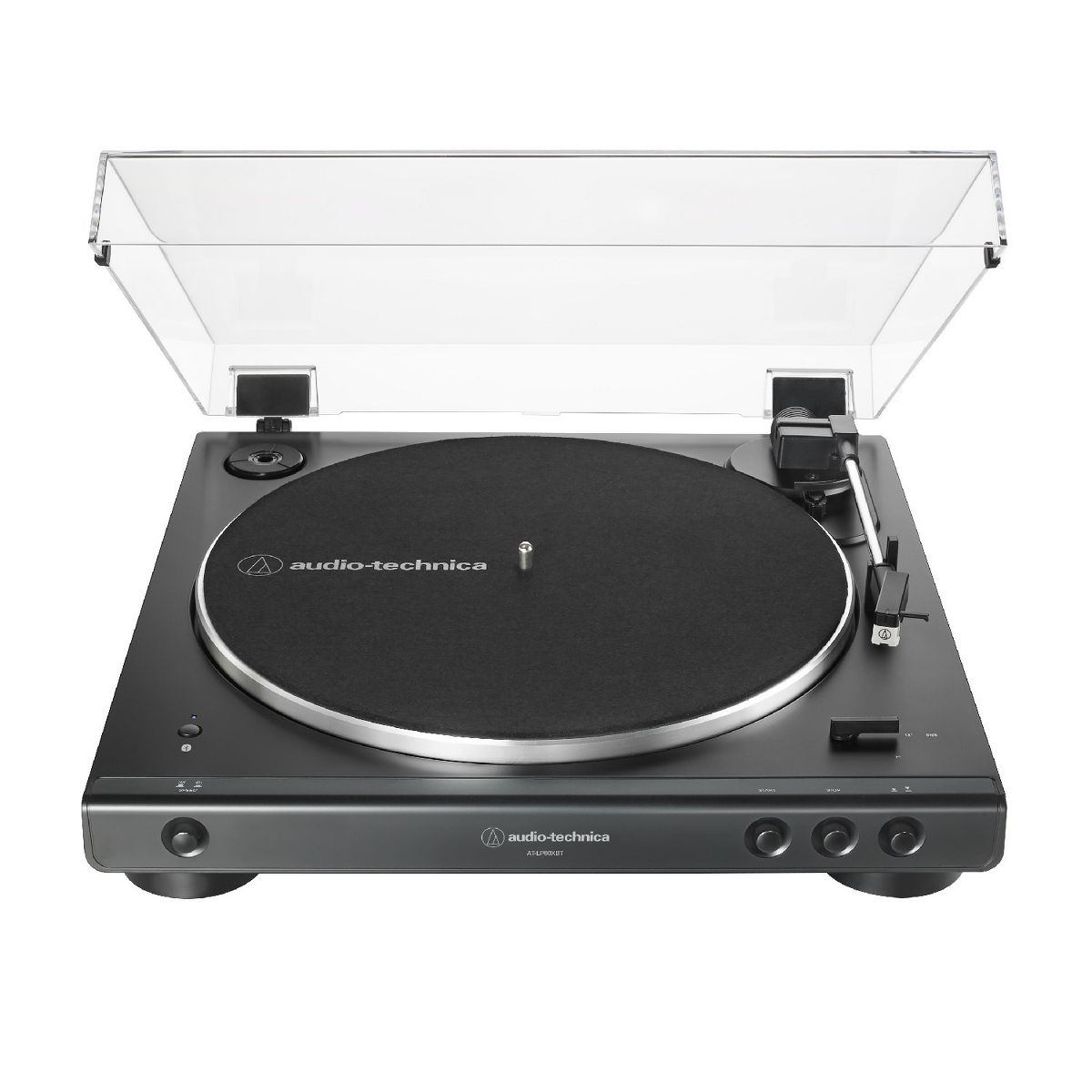 Audio-Technica AT-LP60XBT Bluetooth Fully Automatic Stereo Turntable (Black) The Audio-Technica AT-LP60XBT Bluetooth Fully Automatic Stereo Turntable is bringing vinyl back. Listen to your favorite vinyl tracks from anywhere in your house with Bluetooth connectivity. With the convenience of Bluetooth technology, you will never have to deal with bunches of cables just to listen to your vinyl records. Whether you've never heard the true quality sound of a vinyl record or you're an audiophile looking for your new favorite system, the AT-LP60XBT Turntable was built for you. This stylish and easy to use turntable plays both 33-1/3 and 45 RPM records. With the built-in switchable phono pre-amp, you are directly connected to your home stereo, powered speakers, or sound system. The AT-LP60XBT turntable utilizes an Audio-Technica Dual Magnet phono cartridge with a replaceable diamond stylus. Two Speeds The Audio-Technica Bluetooth Fully Automatic Belt-Drive Stereo Turntable is capable of playing records at two speeds. Play all of your favorite records at both 33-1/3 RPM and 45 RPM. It utilizes an anti-resonance die cast aluminum platter. Superior Sound The AT-LP60XBT Stereo Turntable is powered by a DC servo-controlled motor. With the built-in phono pre-amplifier you can connect to your favorite audio devices to get the sweet sound of vinyl from anywhere. The ATLP60X features a redesigned tonearm base and headshell to improve tracking and reduce resonance. The AC adapter moves the AC/DC conversion outside the chassis to further reduce noise. Dual Magnet Cartridge Audio-Technica has been a leader in phono cartridge design for more than 50 years. The Audio-Technica AT-LP60XBT has a Dual Magnet cartridge with a replaceable diamond stylus. The cartridge is integrated into the headshell for assured performance and ease of setup. Sleek Design This stereo turntable was designed to fit your digital lifestyle. It is combining the classic sound of vinyl with a sleek and stylish modern design. A newly designed arm-base and headshell mean the unique style of the AT-LP60XBT is bringing vinyl into the 21st century. Wireless Connectivity With the AT-LP60XBT you can wirelessly connect with your favorite speakers, headphones or other wireless devices. With its CSR BT chipset, the turntable is even able to connect to devices that support the aptX codec, which offers much-improved sound quality over the standard SBC codec. The AT-LP60XBT can be operated just like a regular turntable with a traditional wired connection. Whether you go wired or wireless you'll get outstanding audio with the ease of automatic operation.