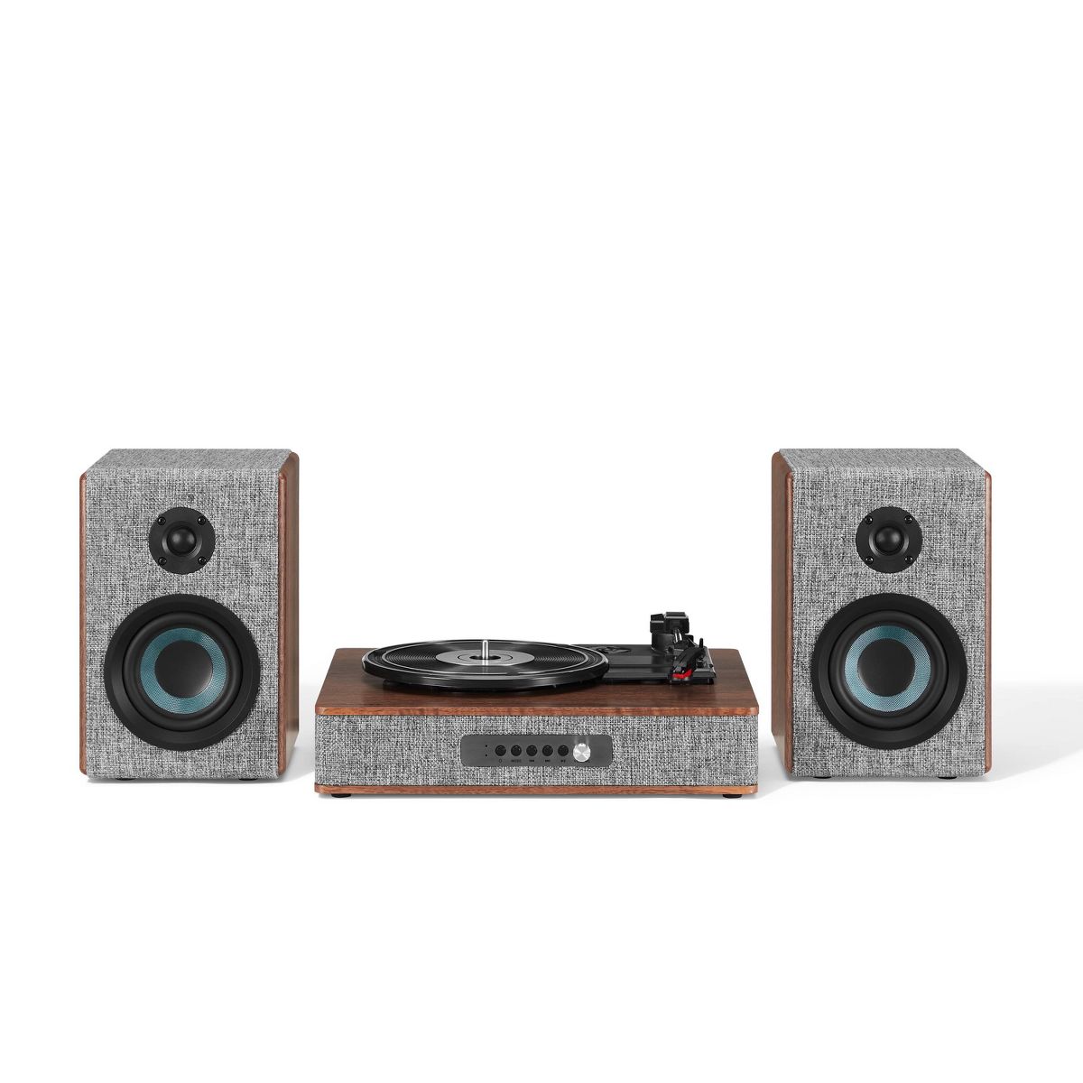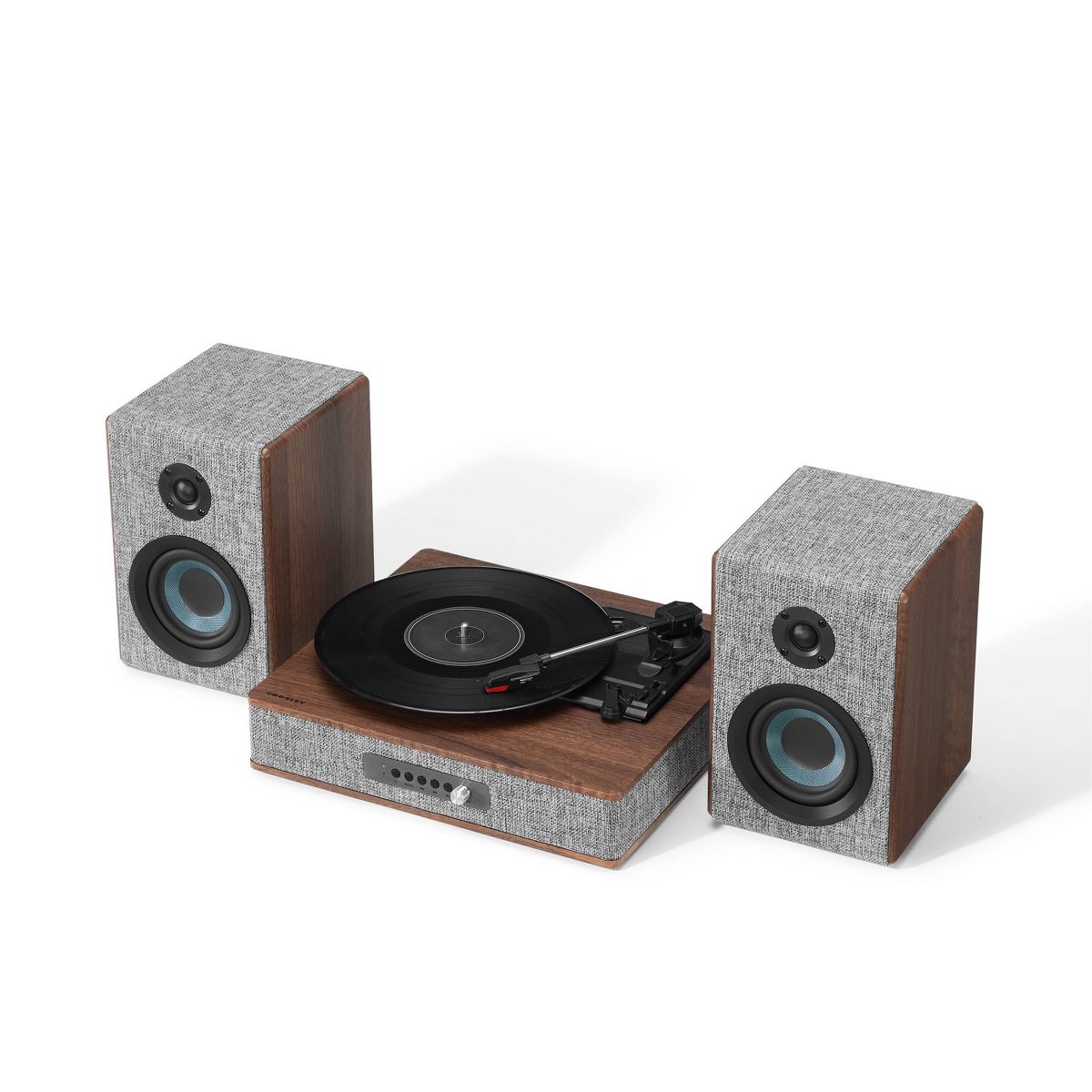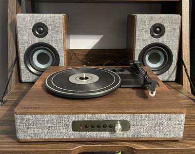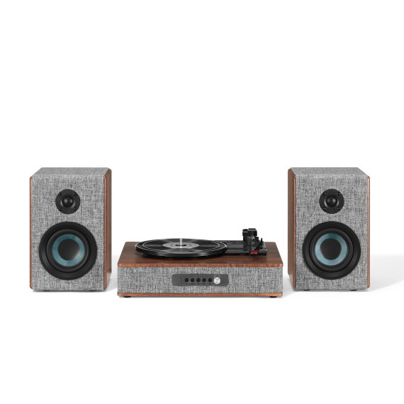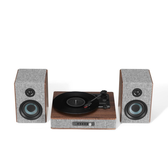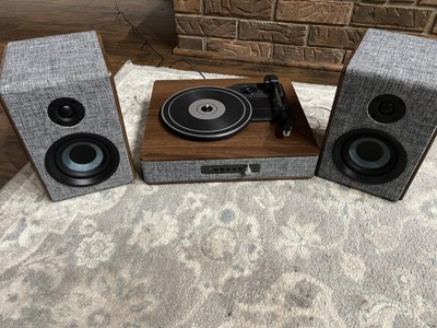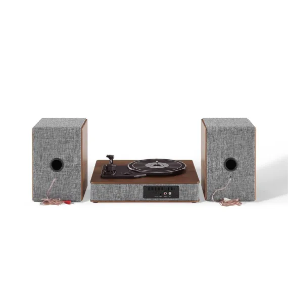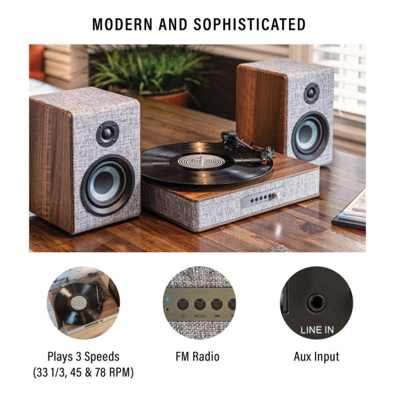 They say clothes make the person, but in this case, they also make the stereo. With eye-catching heather grey fabric accented with walnut wood and silver, the Aria Record Player with Speakers is dressed for success. But this vinyl record player is much more than its charming exterior - the three-speed turntable boasts a built-in Bluetooth receiver and FM radio. Plus, the included bookshelf speakers deliver 100 watts of heart-thumping sound. With capabilities that are impossible to resist, the Aria aligns with the refined tastes of the stylish audiophile.