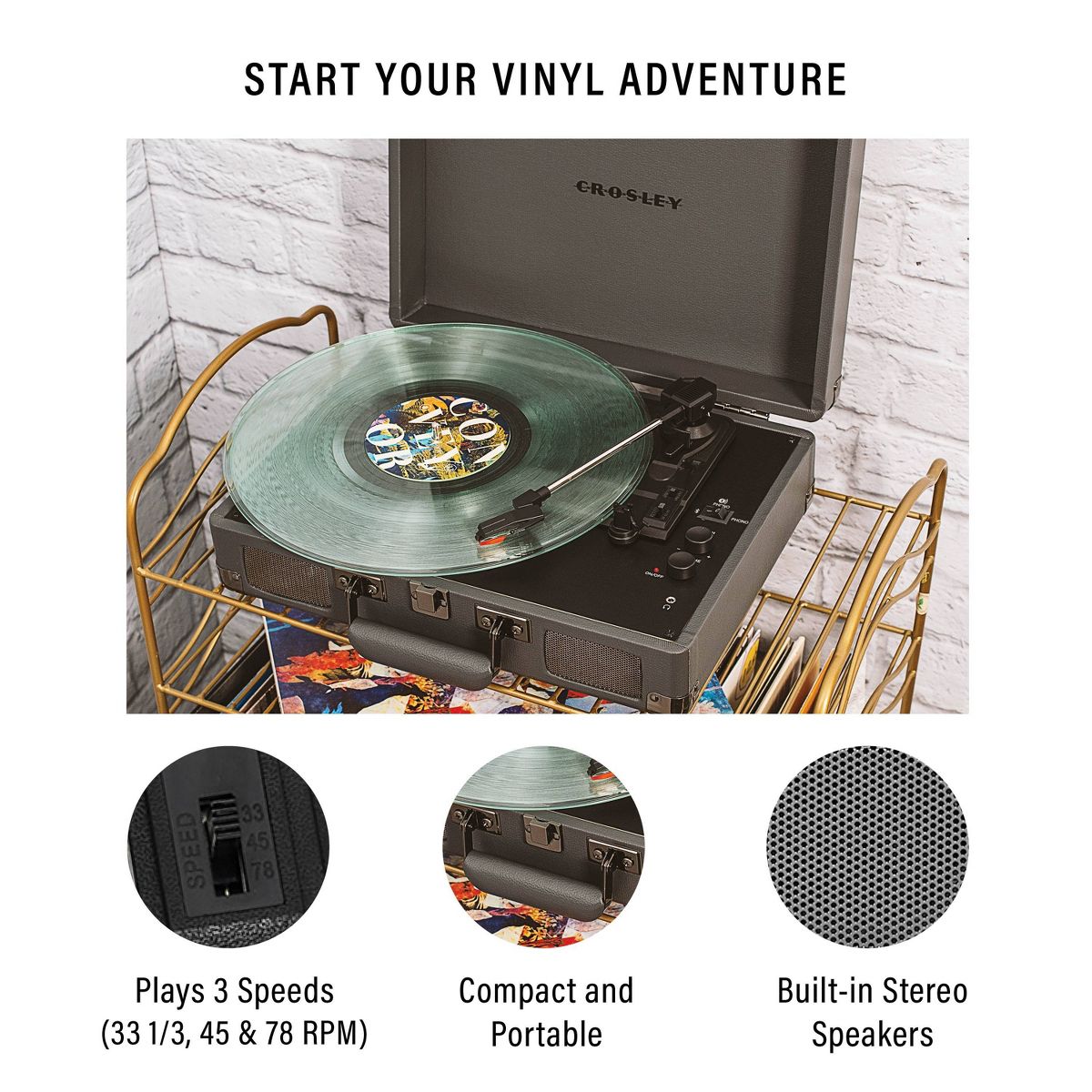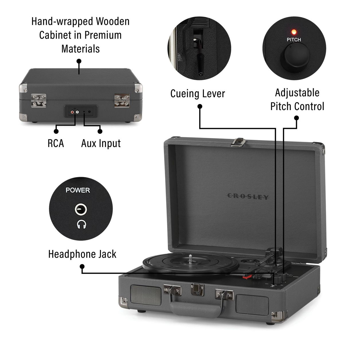 Some say you can’t improve on a classic, but we are here to prove them wrong with the Crosley Cruiser Plus. We took the quintessential Cruiser design and upgraded it with Bluetooth output functionality, so now you can listen to your favorite records on the speaker system of your choice! We retained all the classic features you know and love — the charming portable suitcase shell in a rainbow of colors, three speeds and pitch control for all your listening needs, and a Bluetooth receiver and built-in speakers so you can listen on the go — but with the added option to pair it with your favorite external speakers via Bluetooth output. You asked and we delivered: Classic Cruiser design plus improved functionality is here with the Crosley Cruiser Plus. 13.78”W x 10.24”D x 4.72”H