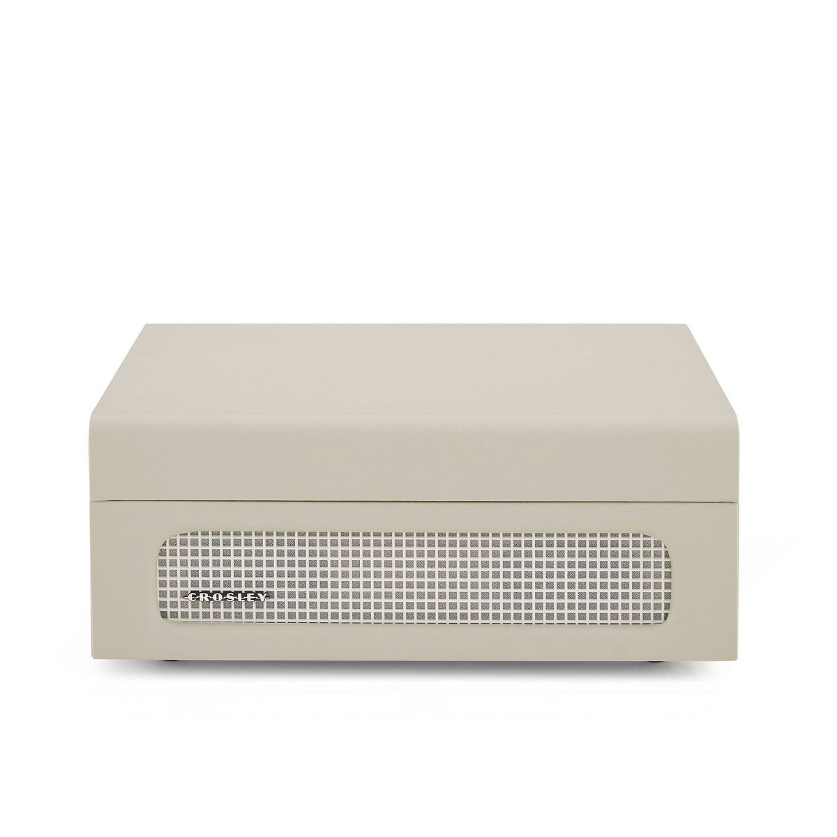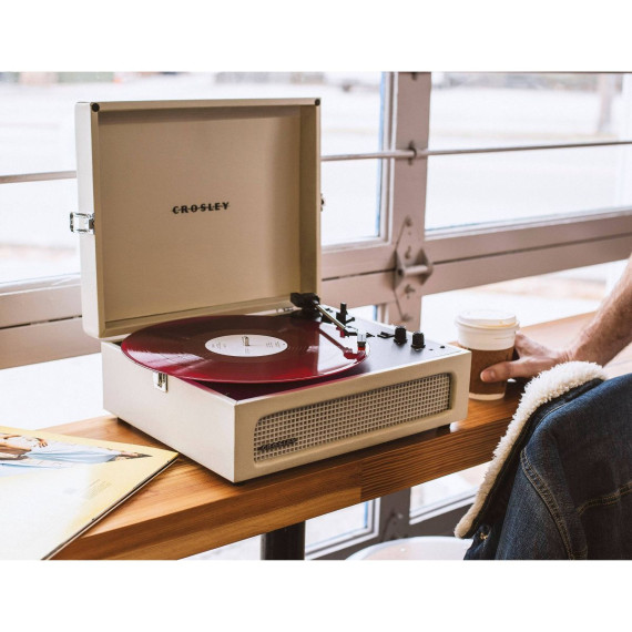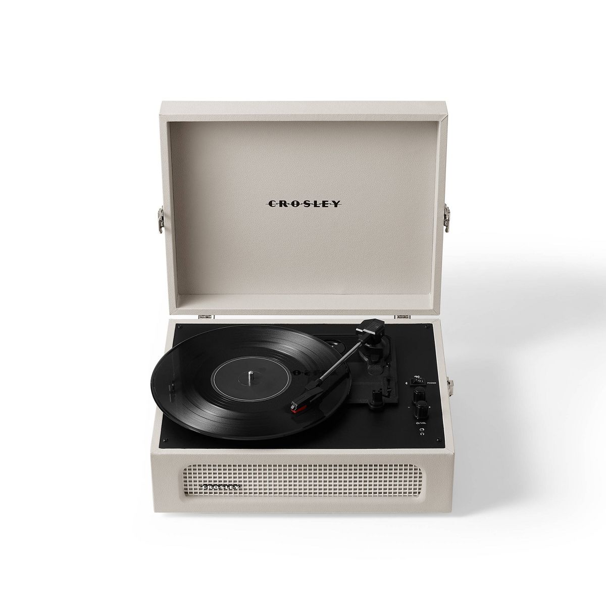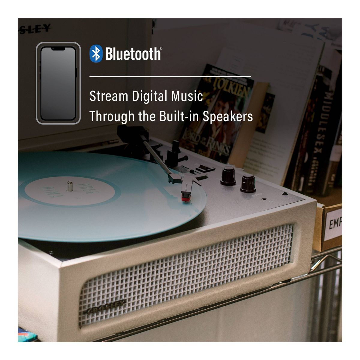 Join Crosley's mission to bring analog music to the masses with the Voyager three-speed turntable. The clean, vintage-inspired aesthetic fits into any space, while the lightweight design allows this record player to travel “further than anyone, or anything in history.” Spin 33 1/3, 45, or 78 RPM records or launch the built-in Bluetooth receiver to transmit your digital music wirelessly through the turntable’s stereo speakers. Discover the RCA outputs on the back that allow you to easily plug into your existing solar music system or bigger speakers to add propulsion to any party. Drop the needle on a reissue of the golden record, probe the adjustable pitch control knob to dial in the speed and prepare for blast off! 14.5”W x 12”D x 6”H