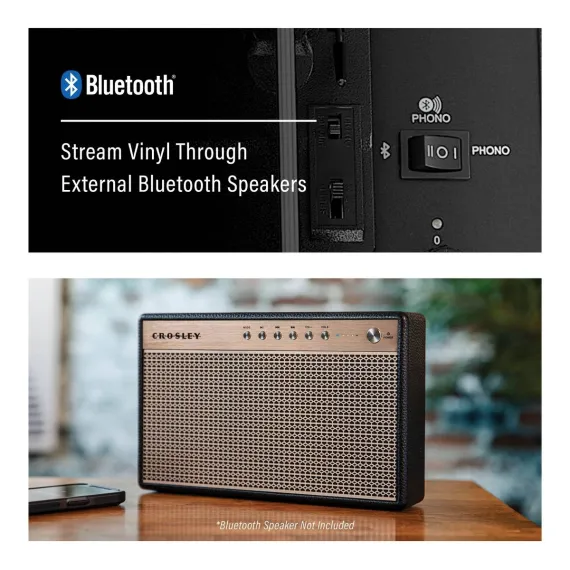 Join Crosley's mission to bring analog music to the masses with the Voyager three-speed turntable. The clean, vintage-inspired aesthetic fits into any space, while the lightweight design allows this record player to travel “further than anyone, or anything in history.” Spin 33 1/3, 45, or 78 RPM records or launch the built-in Bluetooth receiver to transmit your digital music wirelessly through the turntable’s stereo speakers. Discover the RCA outputs on the back that allow you to easily plug into your existing solar music system or bigger speakers to add propulsion to any party. Drop the needle on a reissue of the golden record, probe the adjustable pitch control knob to dial in the speed and prepare for blast off! 14.5”W x 12”D x 6”H