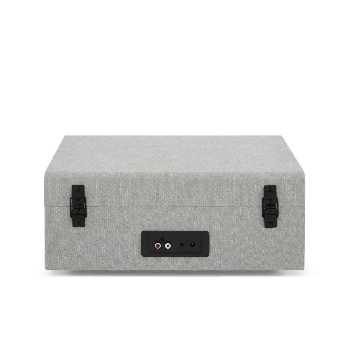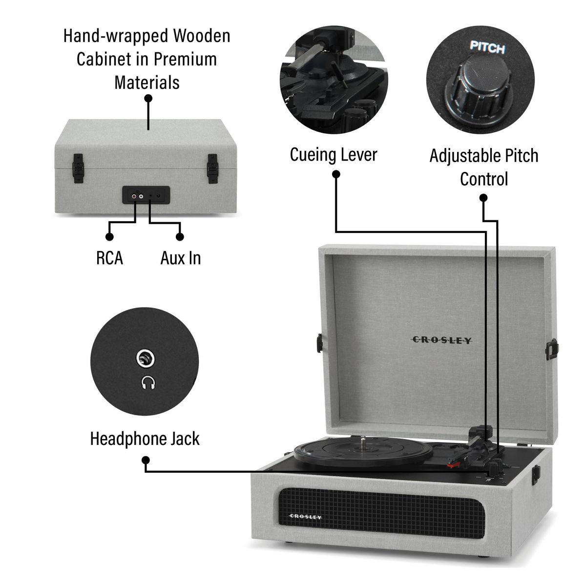 Join Crosley's mission to bring analog music to the masses with the Voyager three-speed turntable. The clean, vintage-inspired aesthetic fits into any space, while the lightweight design allows this record player to travel “further than anyone, or anything in history.” Spin 33 1/3, 45, or 78 RPM records or launch the built-in Bluetooth receiver to transmit your digital music wirelessly through the turntable’s stereo speakers. Discover the RCA outputs on the back that allow you to easily plug into your existing solar music system or bigger speakers to add propulsion to any party. Drop the needle on a reissue of the golden record, probe the adjustable pitch control knob to dial in the speed and prepare for blast off! 14.5”W x 12”D x 6”H