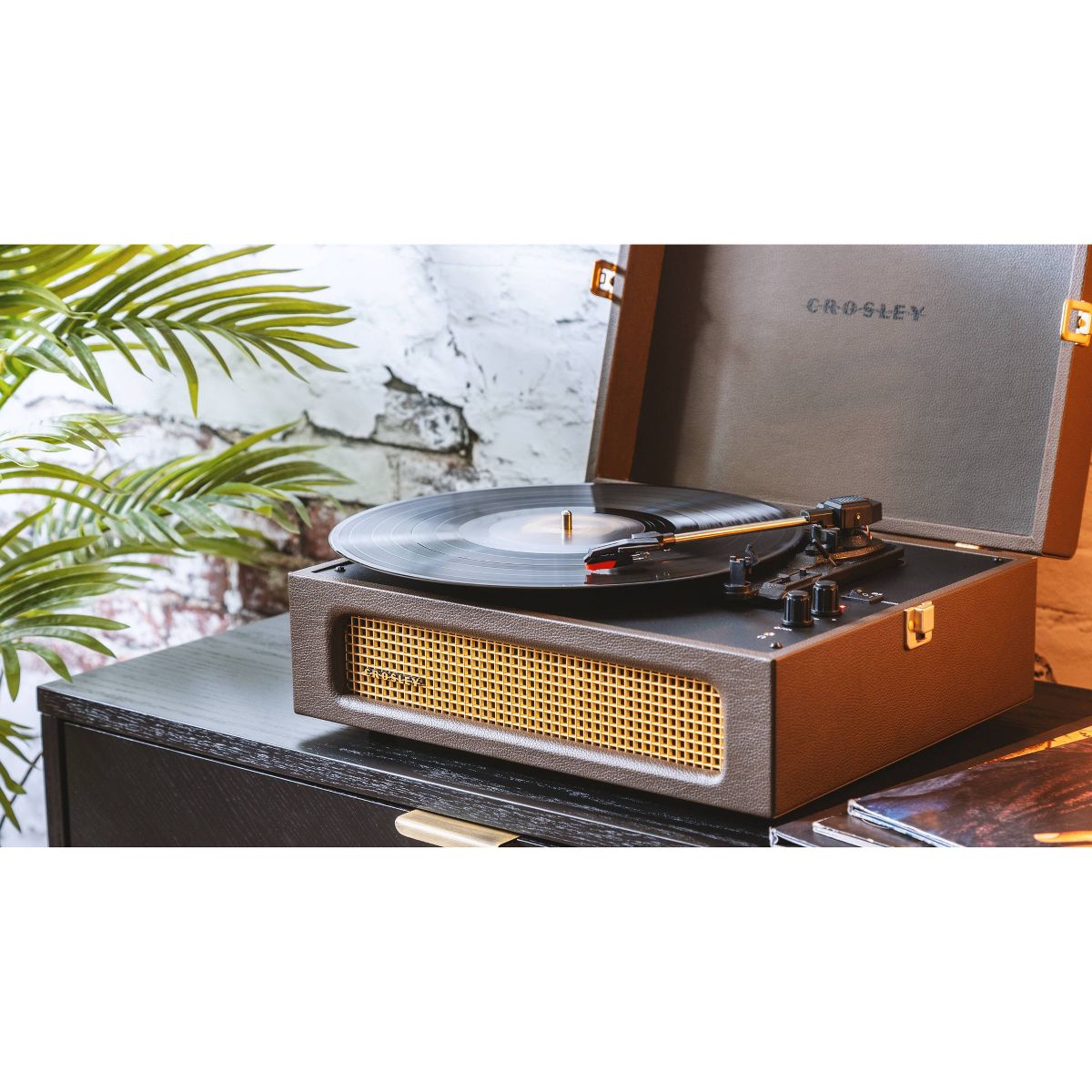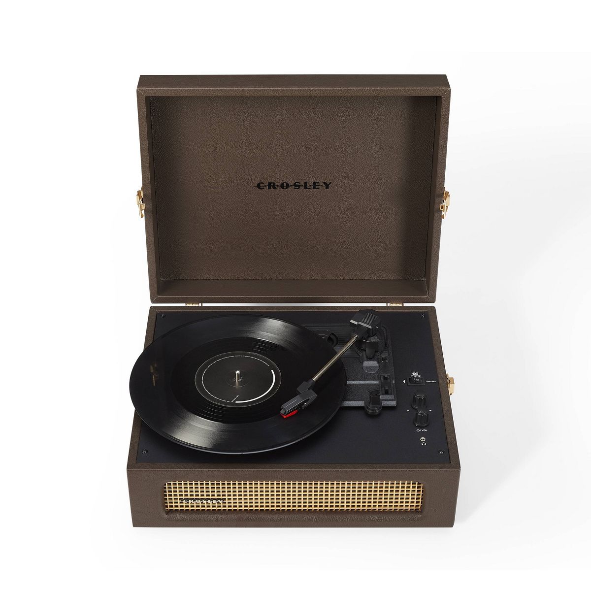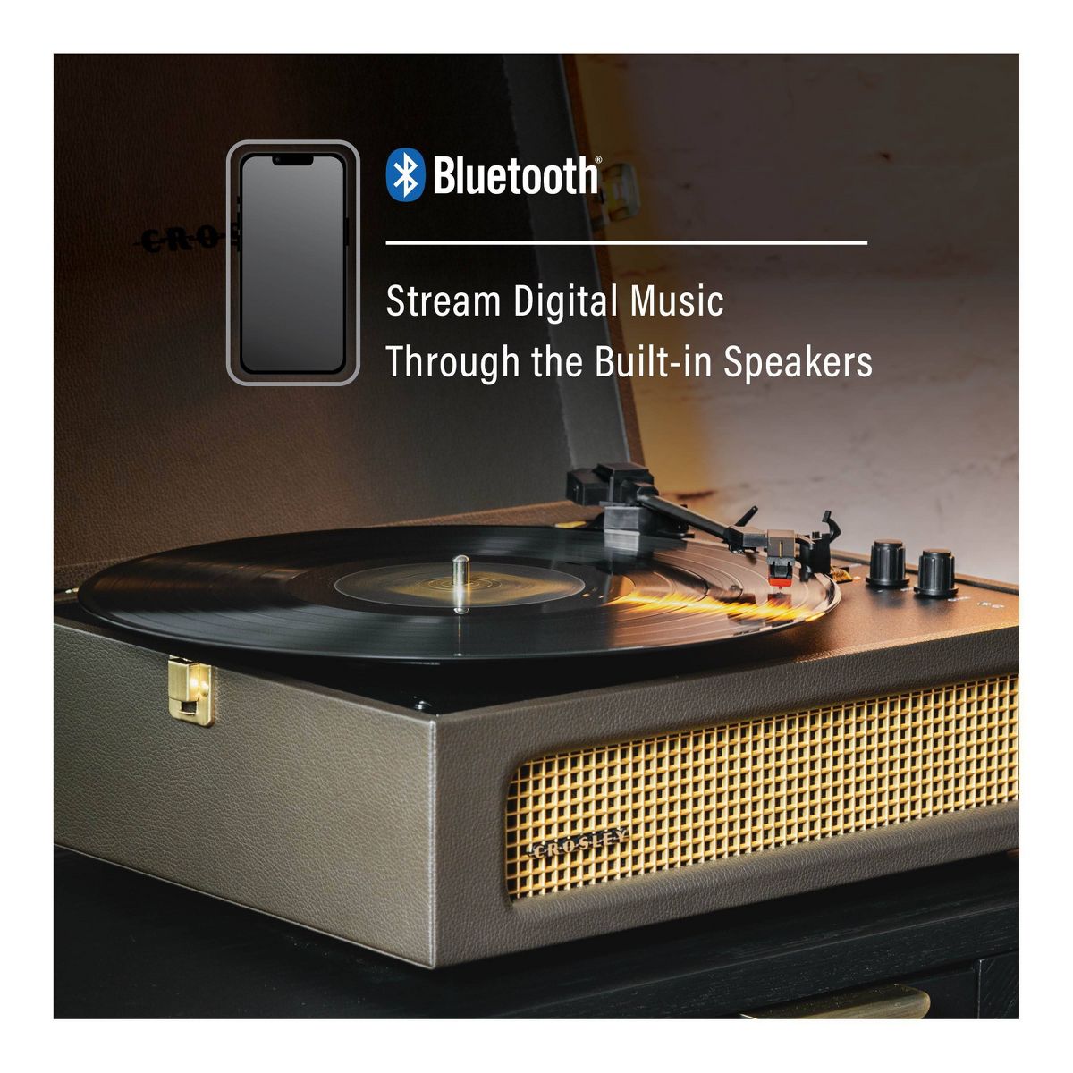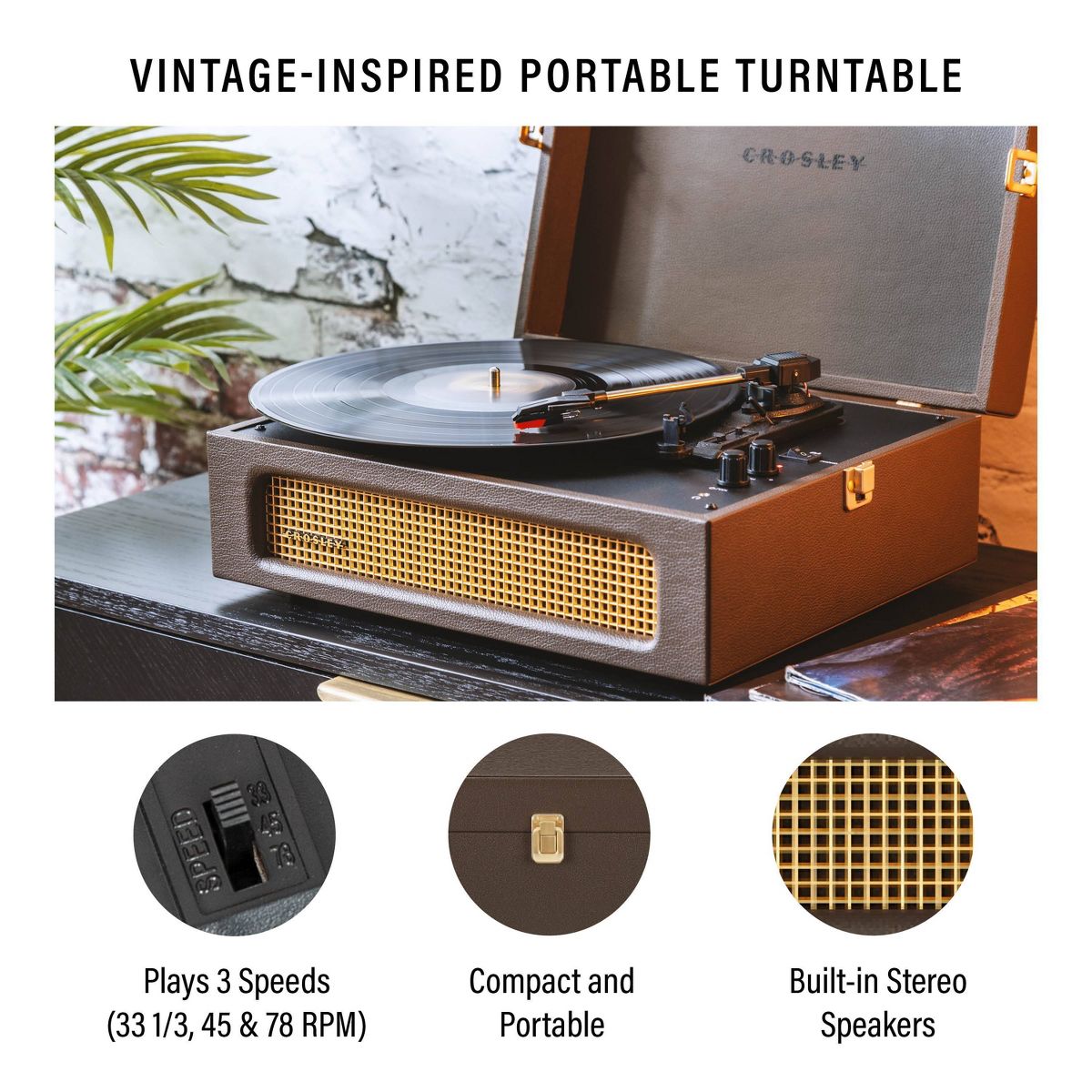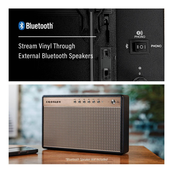 Join Crosley's mission to bring analog music to the masses with the Voyager three-speed turntable. The clean, vintage-inspired aesthetic fits into any space, while the lightweight design allows this record player to travel “further than anyone, or anything in history.” Spin 33 1/3, 45, or 78 RPM records or launch the built-in Bluetooth receiver to transmit your digital music wirelessly through the turntable’s stereo speakers. Discover the RCA outputs on the back that allow you to easily plug into your existing solar music system or bigger speakers to add propulsion to any party. Drop the needle on a reissue of the golden record, probe the adjustable pitch control knob to dial in the speed and prepare for blast off! 14.5”W x 12”D x 6”H