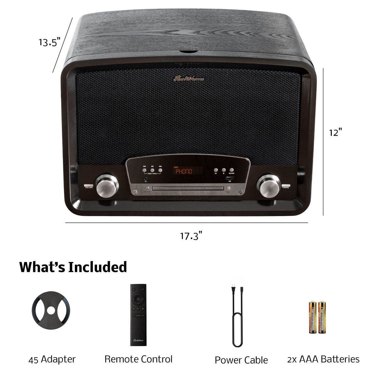 What's Included: 7-in-1 Vinyl Record Player, 45 Record Adaptor, Remote Control, Power Cord, 2 AAA Batteries, User Manual, Quick Start Guide, 1 Year Manufacturer's Warranty