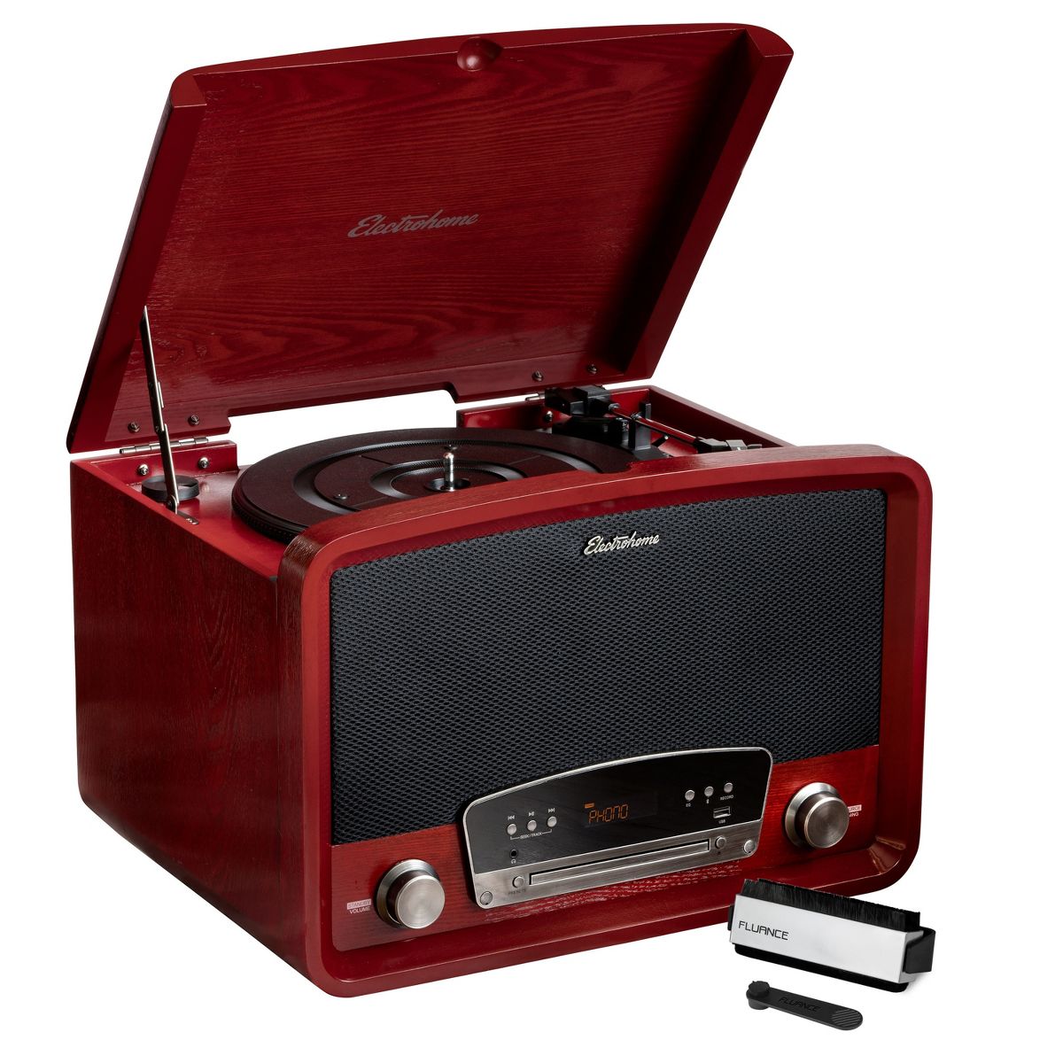 Electrohome Kingston Vintage Vinyl Record Player, Turntable Bluetooth Radio CD Aux USB Vinyl to MP3, Record Cleaning Kit - Cherry