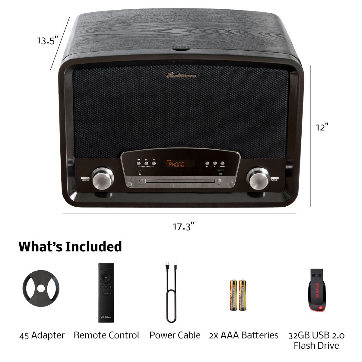 What's Included: 7-in-1 Vinyl Record Player, 45 Record Adaptor, Remote Control, 32GB USB Flash Drive, Power Cord, 2 AAA Batteries, User Manual, Quick Start Guide, 1 Year Manufacturer's Warranty