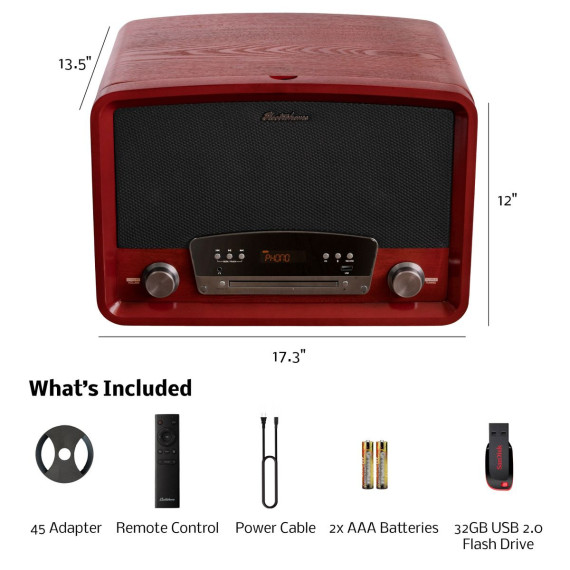 What's Included: 7-in-1 Vinyl Record Player, 45 Record Adaptor, Remote Control, 32GB USB Flash Drive, Power Cord, 2 AAA Batteries, User Manual, Quick Start Guide, 1 Year Manufacturer's Warranty