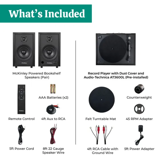 What's Included: Montrose Wireless Record Player with Dust Cover, Audio Technica AT3600L Cartridge (Pre-installed), Felt Turntable Mat, Counterweight, 45 RPM Adapter, 5ft 100V - 240V (50/60Hz) AC Power Adapter, 4ft RCA Cable with Ground Wire, EB30 Powered Bookshelf Speakers (pair), Remote Control, 2x AAA Batteries, 6ft Power Cord, 8ft 22 Gauge Speaker Wire, 4ft Aux to RCA Cable, User Manual, 1 Year Manufacturer's Warranty