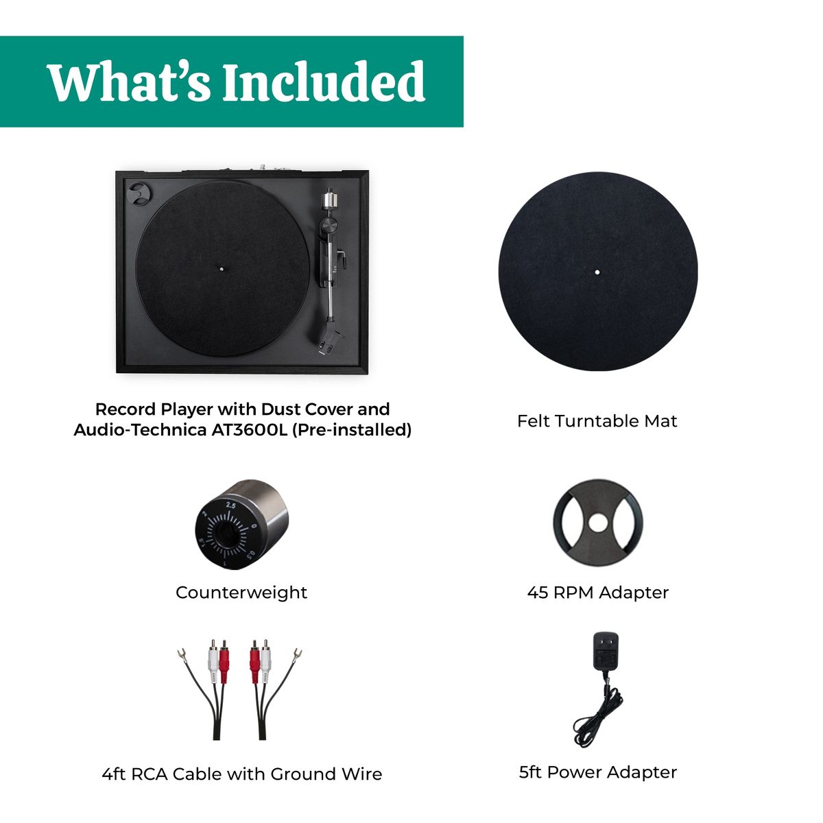 What's Included: Montrose Record Player with Dust Cover, Audio-Technica AT3600L Cartridge (Pre-installed), Felt Turntable Mat, Counterweight, 45 RPM Adapter, 5ft 100V - 240V (50/60Hz) AC Power Adapter, 4ft RCA Cable with Ground Wire, User Manual, 1 Year Manufacturer's Warranty