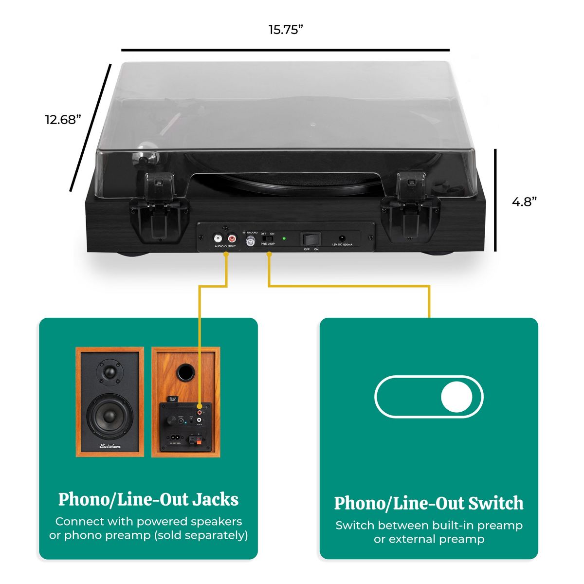 Electrohome Montrose Vinyl Record Player, Belt-Drive Turntable, Audio-Technica Stylus, Built-in Preamp, Auto-Stop - Teak