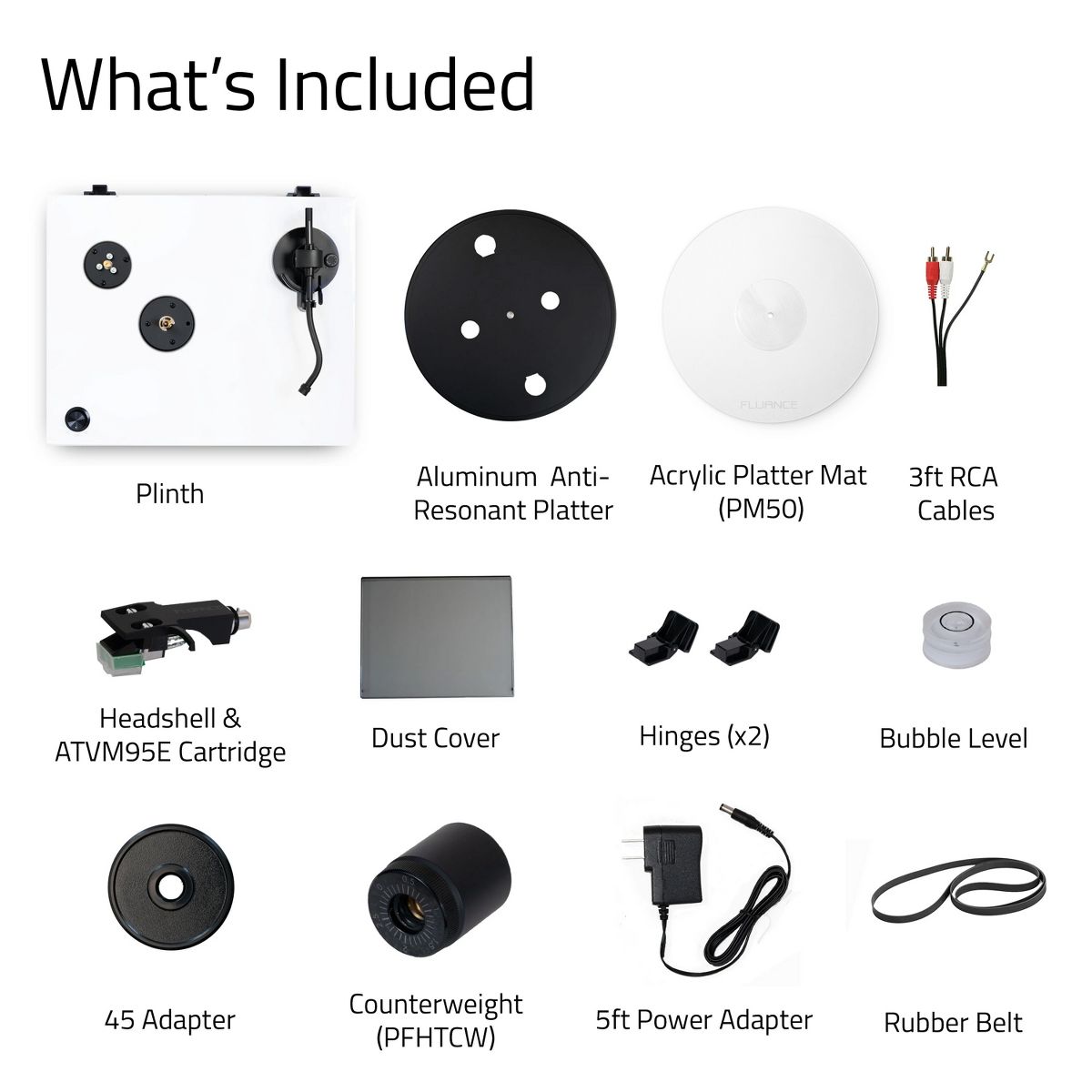 What's Included: RT81P Turntable, Dust Cover, 2x Dust Cover Hinges, Headshell with Audio Technica VM95E Cartridge, Counterweight (PFHTCW), Aluminum Anti-Resonant Platter, Acrylic Platter Mat, Rubber Belt, 45 Adapter, Bubble Level, 3ft RCA Cable With Ground Wire (PFHTCA), 5ft 100V - 240V (50/60Hz) AC Power Adapter, User Manual, 2 Year Manufacturer's Warranty
