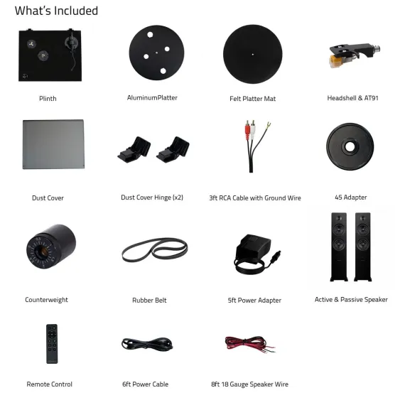 What's Included: RT80 Turntable, Dust Cover, 2x Dust Cover Hinges, Headshell with Audio Technica AT91 Cartridge, Counterweight, Aluminum Platter, Rubber Belt, 45 Adapter, Felt Platter Mat, 3ft RCA Cable With Ground Wire, 5ft 100V - 240V (50/60Hz) AC Power Adapter, User Manual, Ai81 Powered Floorstanding Speakers (pair), Remote Control, 2x AAA Batteries, 6ft Power Cable , 8ft 18 Gauge Speaker Wire, Quick Start Guide, Fluance Catalog, 2 Year Manufacturer's Warranty
