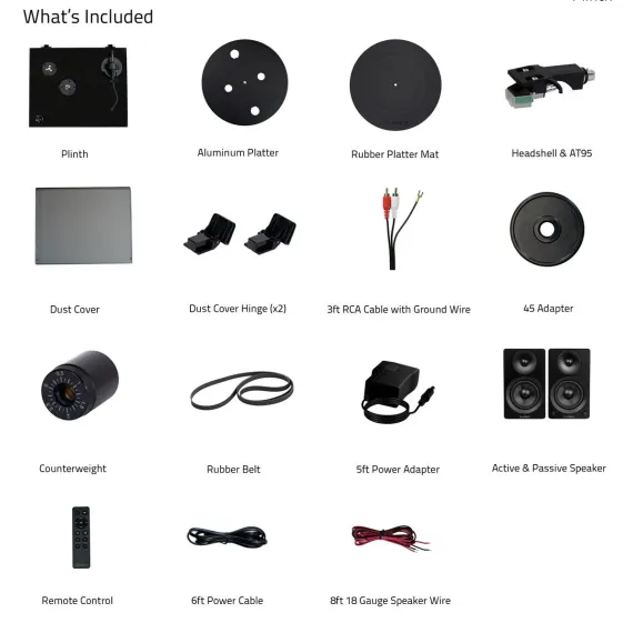 What's Included: RT81 Turntable, Dust Cover, 2x Dust Cover Hinges, Headshell with Audio Technica AT95E Cartridge, Counterweight, Aluminum Platter, Rubber Belt, 45 Adapter, Rubber Platter Mat, 3ft RCA Cable With Ground Wire, 5ft 100V - 240V (50/60Hz) AC Power Adapter, User Manual, Ai41 Powered Bookshelf Speakers (pair), Remote Control, 2x AAA Batteries, 6ft Power Cable, 8ft 18 Gauge Speaker Wire, Quick Start Guide, Fluance Catalog, 2 Year Manufacturer's Warranty