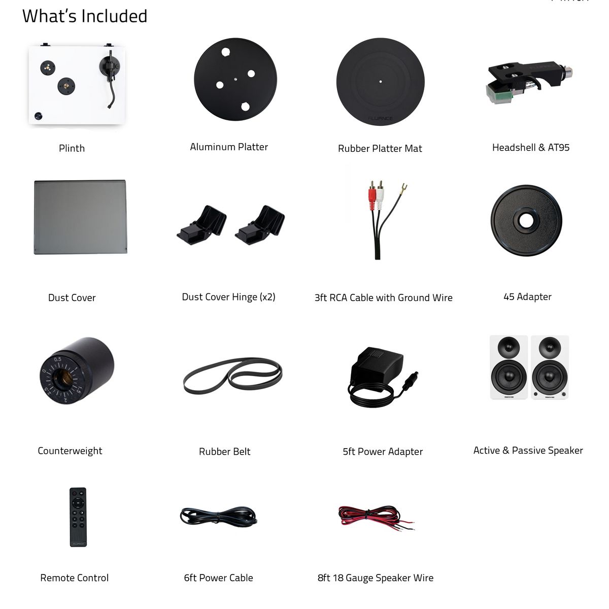 What's Included: RT81 Turntable, Dust Cover, 2x Dust Cover Hinges, Headshell with Audio Technica AT95E Cartridge, Counterweight, Aluminum Platter, Rubber Belt, 45 Adapter, Rubber Platter Mat, 3ft RCA Cable With Ground Wire, 5ft 100V - 240V (50/60Hz) AC Power Adapter, User Manual, Ai41 Powered Bookshelf Speakers (pair), Remote Control, 2x AAA Batteries, 6ft Power Cable, 8ft 18 Gauge Speaker Wire, Quick Start Guide, Fluance Catalog, 2 Year Manufacturer's Warranty