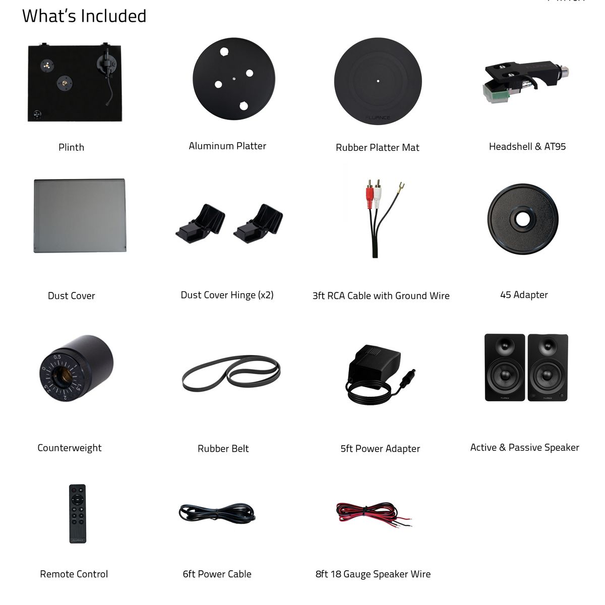 What's Included: RT81 Turntable, Dust Cover, 2x Dust Cover Hinges, Headshell with Audio Technica AT95E Cartridge, Counterweight, Aluminum Platter, Rubber Belt, 45 Adapter, Rubber Platter Mat, 3ft RCA Cable With Ground Wire, 5ft 100V - 240V (50/60Hz) AC Power Adapter, User Manual, Ai61 Powered Bookshelf Speakers (pair), Remote Control, 2x AAA Batteries, 6ft Power Cable, 8ft 18 Gauge Speaker Wire, Quick Start Guide, Fluance Catalog, 2 Year Manufacturer's Warranty