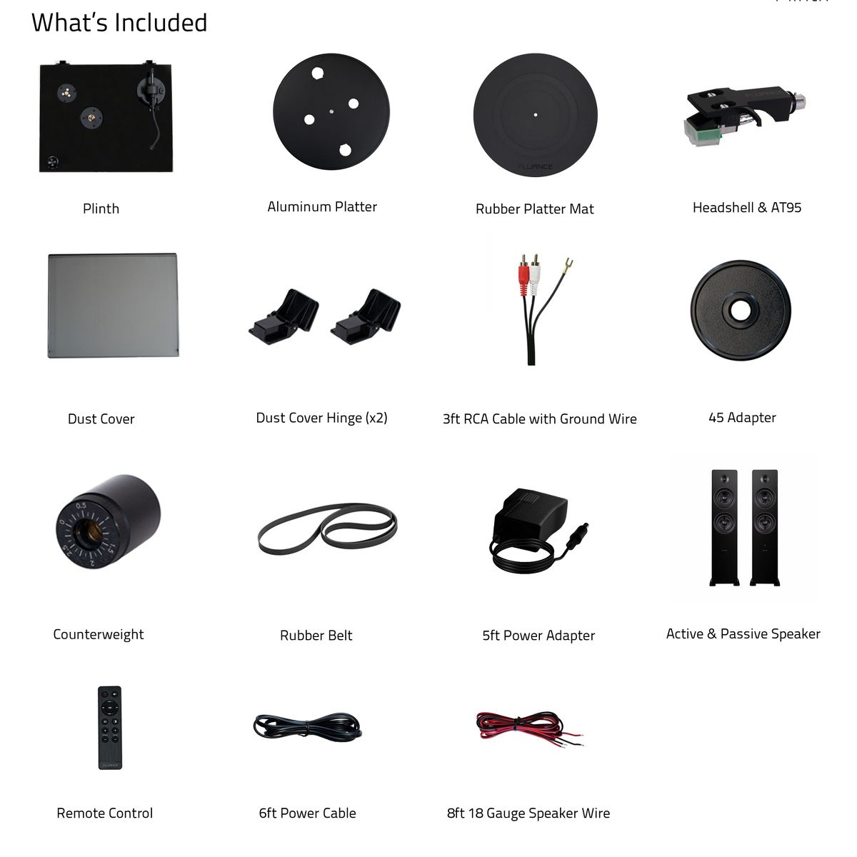 What's Included: RT81 Turntable, Dust Cover, 2x Dust Cover Hinges, Headshell with Audio Technica AT95E Cartridge, Counterweight (PFHTCW), Aluminum Platter, Rubber Belt, 45 Adapter, Rubber Platter Mat, 3ft RCA Cable With Ground Wire (PFHTCW), 5ft 100V - 240V (50/60Hz) AC Power Adapter, User Manual, Ai81 Powered Floorstanding Speakers (pair), Remote Control, 2x AAA Batteries, 6ft Power Cable , 8ft 18 Gauge Speaker Wire, Quick Start Guide, Fluance Catalog, 2 Year Manufacturer's Warranty