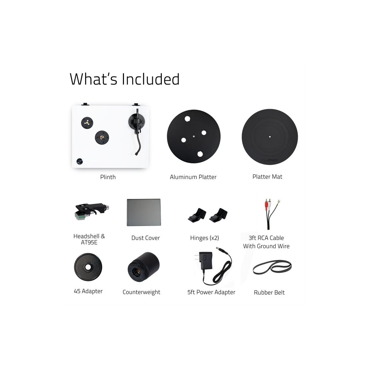 45 Adapter, AC Power Adapter, Dust Cover, Phono Cartridge, RCA Cable, User Manual