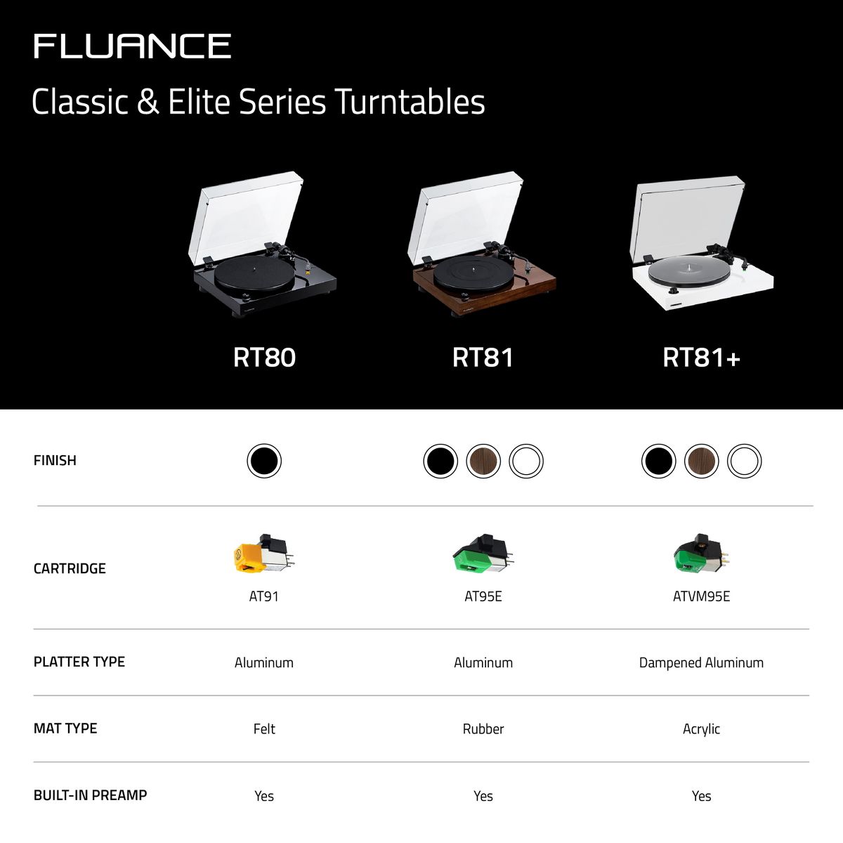 Fluance's Elite High Fidelity Turntable plays traditional LP and EP vinyl records with stunning quality that achieves the purest sound reproduction. When you want the absolute best in music performance, pull out your favorite 33 1/3 or 45 RPM records, hook up your sound system, drop the needle, and immerse yourself in the Fluance RT81 Record Player.