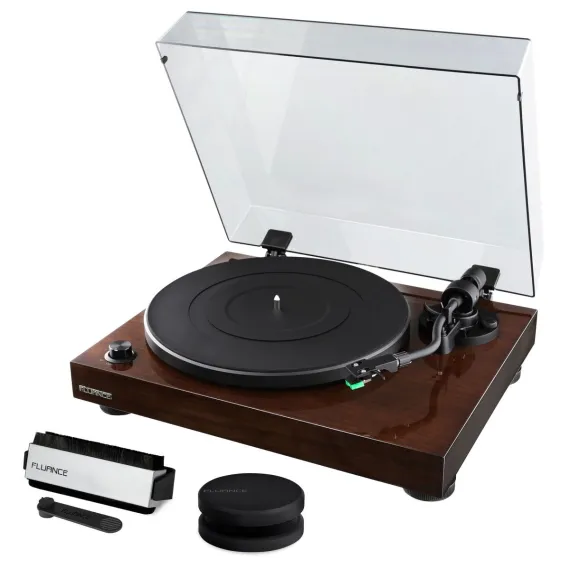 Fluance's RT81 High Fidelity Turntable and Accessory Kit plays vinyl records with stunning quality that achieves the purest sound reproduction. Experience perfect analog playback and establish closer contact between your record and the turntable platter with the Record Weight reducing resonance and undesired vibrations while extending the life of your records and turntable stylus with the Vinyl Cleaning Kit.