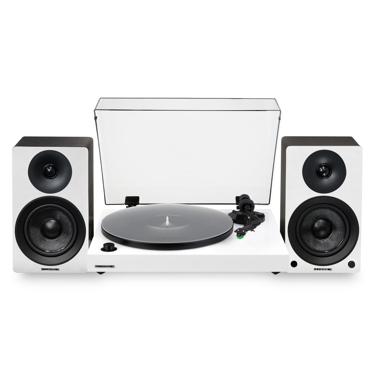 What's Included: RT81P Turntable, Dust Cover, 2x Dust Cover Hinges, Headshell with Audio Technica VM95E Cartridge, Counterweight, Aluminum Anti-Resonant Platter, Acrylic Platter Mat, Rubber Belt, 45 Adapter, Bubble Level, 3ft RCA Cable With Ground Wire, 5ft 100V - 240V (50/60Hz) AC Power Adapter, Ai41 Powered Bookshelf Speakers (pair), Remote Control, 2x AAA Batteries, 6ft Power Cable, 8ft 18 Gauge Speaker Wire, Quick Start Guide, Fluance Catalog, 2 Year Manufacturer's Warranty
