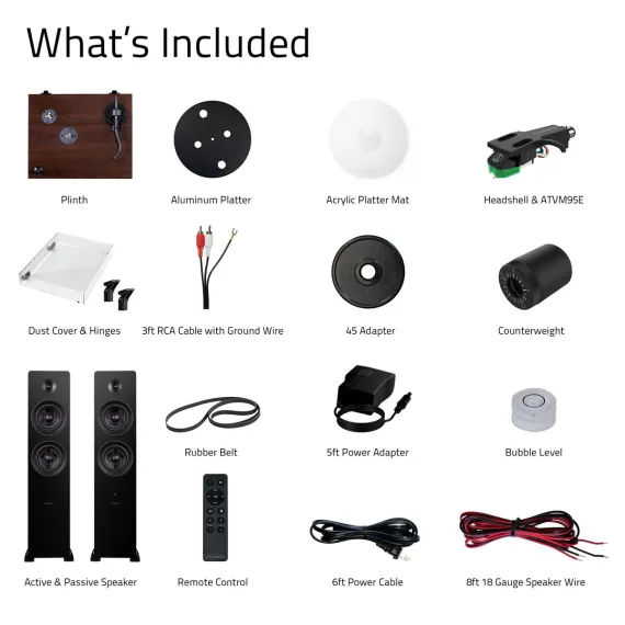 What's Included: RT81P Turntable, Dust Cover, 2x Dust Cover Hinges, Headshell with Audio Technica VM95E Cartridge, Counterweight, Aluminum Anti-Resonant Platter, Acrylic Platter Mat, Rubber Belt, 45 Adapter, Bubble Level, 3ft RCA Cable With Ground Wire, 5ft 100V - 240V (50/60Hz) AC Power Adapter, Ai81 Powered Floorstanding Speakers (pair), Remote Control, 2x AAA Batteries, 6ft Power Cable, 8ft 18 Gauge Speaker Wire, Quick Start Guide, Fluance Catalog, 2 Year Manufacturer's Warranty