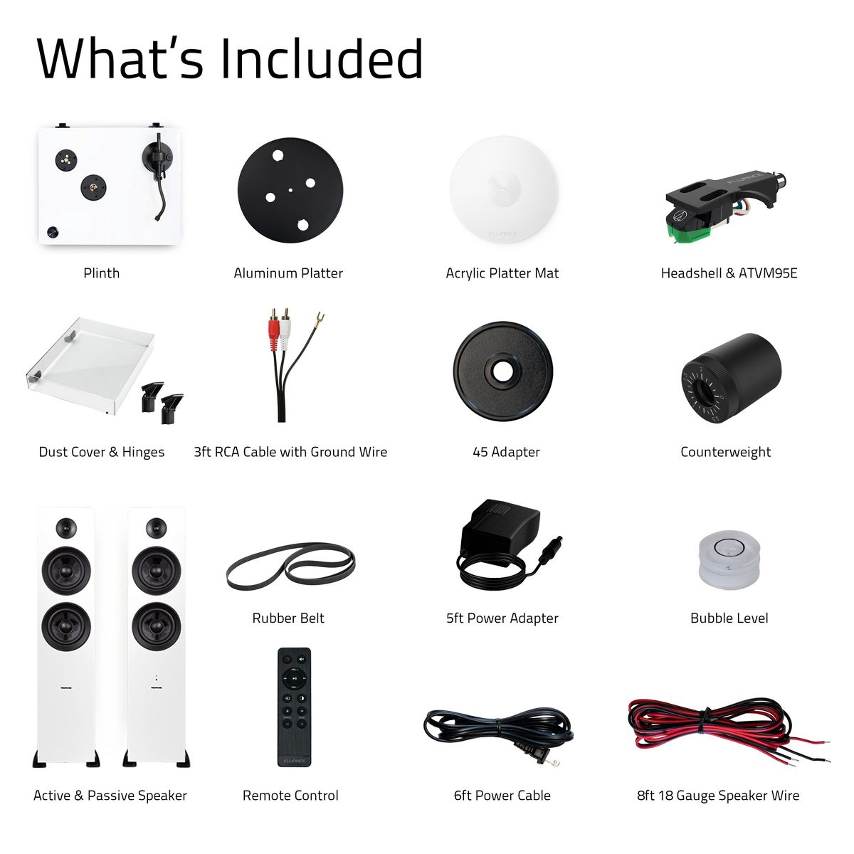 What's Included: RT81P Turntable, Dust Cover, 2x Dust Cover Hinges, Headshell with Audio Technica VM95E Cartridge, Counterweight, Aluminum Anti-Resonant Platter, Acrylic Platter Mat, Rubber Belt, 45 Adapter, Bubble Level, 3ft RCA Cable With Ground Wire, 5ft 100V - 240V (50/60Hz) AC Power Adapter, Ai81 Powered Floorstanding Speakers (pair), Remote Control, 2x AAA Batteries, 6ft Power Cable, 8ft 18 Gauge Speaker Wire, Quick Start Guide, Fluance Catalog, 2 Year Manufacturer's Warranty