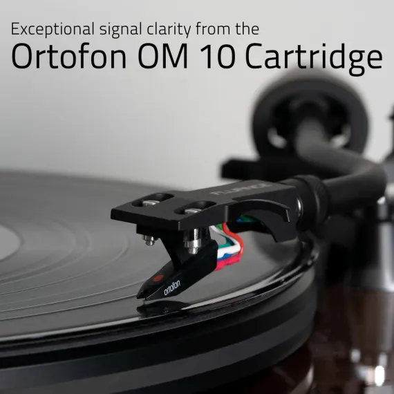 Savor the rich sound of the Ortofon OM10 elliptical stylus; renowned for precise and accurate playback while having a flat frequency response for a natural sound. The servo-controlled belt drive motor maintains an accurate speed while the metal platter, high mass MDF wood plinth and vibration isolation feet inhibit the transfer of unwanted resonance allowing for a greater low frequency signal pickup and improved imaging.